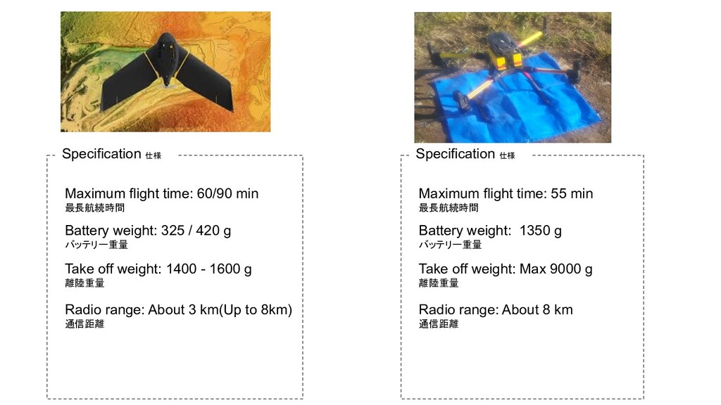 420 g バッテリー重量 Take off weight: 1400 - 1600 g 離陸重量 Radio range: About 3 km(Up to 8km) 通信距離 Specification 仕様 Maximum flight time: 55 min 最長航続時間 Battery weight: 1350 g バッテリー重量 Take off weight: Max 9000 g 離陸重量 Radio range: About 8 km 通信距離 Specification 仕様