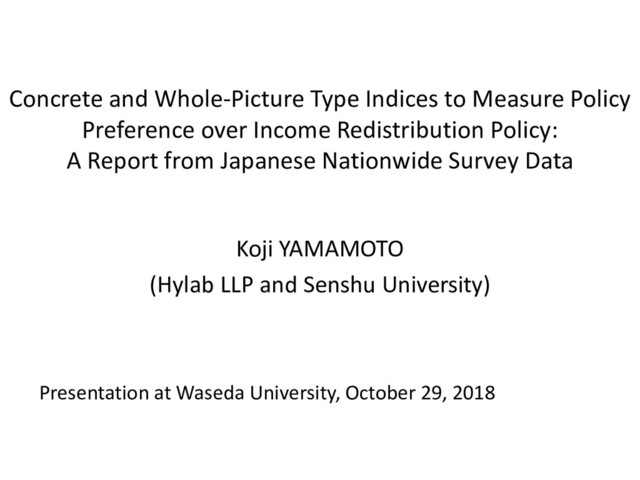 This presentation aims to show (1) a set of questionnaire items to measure redistributive policy preference using concrete and whole-picture type indices, which was adopted by a Japanese nationwide survey, (2) the resulted data, and (3) the perspectives for future research of our interest. We emphasize the importance of measuring individuals’ policy preference using concrete-level indices obtained from respondents looking at the whole picture of a society.