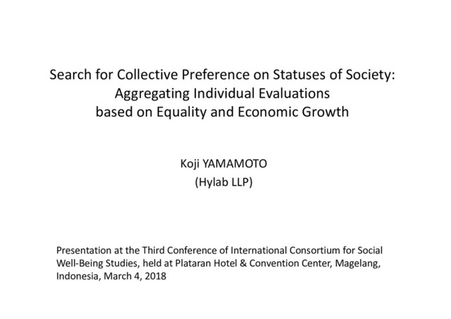 Evaluations based on Equality and Economic Growth Koji YAMAMOTO (Hylab LLP) Presentation at the Third Conference of International Consortium for Social Well‐Being Studies, held at Plataran Hotel & Convention Center, Magelang, Indonesia, March 4, 2018