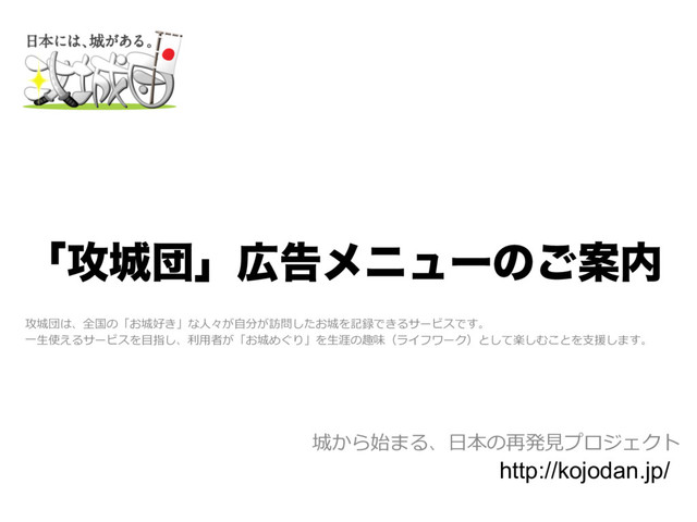 地元グルメを堪能していただくプラン • 現地ガイドによるガイドツアーを利⽤したプラン • 温泉地に宿泊することをオススメするプラン • 美術館など周辺の観光スポットをあわせて紹介するプラン • ⼤河ドラマ等の関連スポットをめぐるプラン ご活⽤例 過去実績 • 坂井市観光連盟(丸岡城と城下町を⽇帰りでめぐる記事) • 七尾商⼯会議所(七尾城と⼩丸⼭城を⼀泊⼆⽇でめぐる記事) 価格 500,000円(素材提供による記事制作の場合) 1,000,000円(現地取材を含む記事制作の場合) 掲載保証期間 掲載⽇から1年間 販売単位 1記事 掲載位置 ブログ内記事ページ [Sponsored]表記を明⽰し、指定枠内に紹介⽂を掲載します 原稿 編集部にて執筆いたします。公開前に確認が可能です 記事公開 平⽇の任意の⽇時 備考 記事内容および切り⼝は、協議のうえ決定します。 お申し込みから掲載開始まで20営業⽇前後を想定します。 特別な事情がないかぎり保証期間後も継続して掲載されます。 メールマガジンで1回、SNSで複数回、告知をおこないます。 サイト内のPR枠を使⽤して⼀定期間告知をおこないます。 露出回数等、数字の保証はありませんが「表⽰回数」「訪問者数」 「閲覧時間」「SNS反応数」のレポートが可能です。 出発時間から各スポットの所要 時間を考慮したモデルコースを 豊富な写真とともに紹介 対象のお城のページ からリンクします