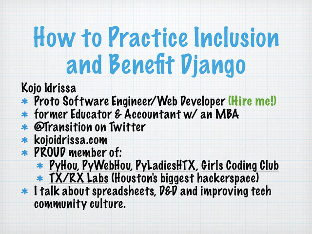 Software Engineer/Web Developer (Hire me!) former Educator & Accountant w/ an MBA @Transition on Twitter kojoidrissa.com PROUD member of: PyHou, PyWebHou, PyLadiesHTX, Girls Coding Club TX/RX Labs (Houston's biggest hackerspace) I talk about spreadsheets, D&D and improving tech community culture.