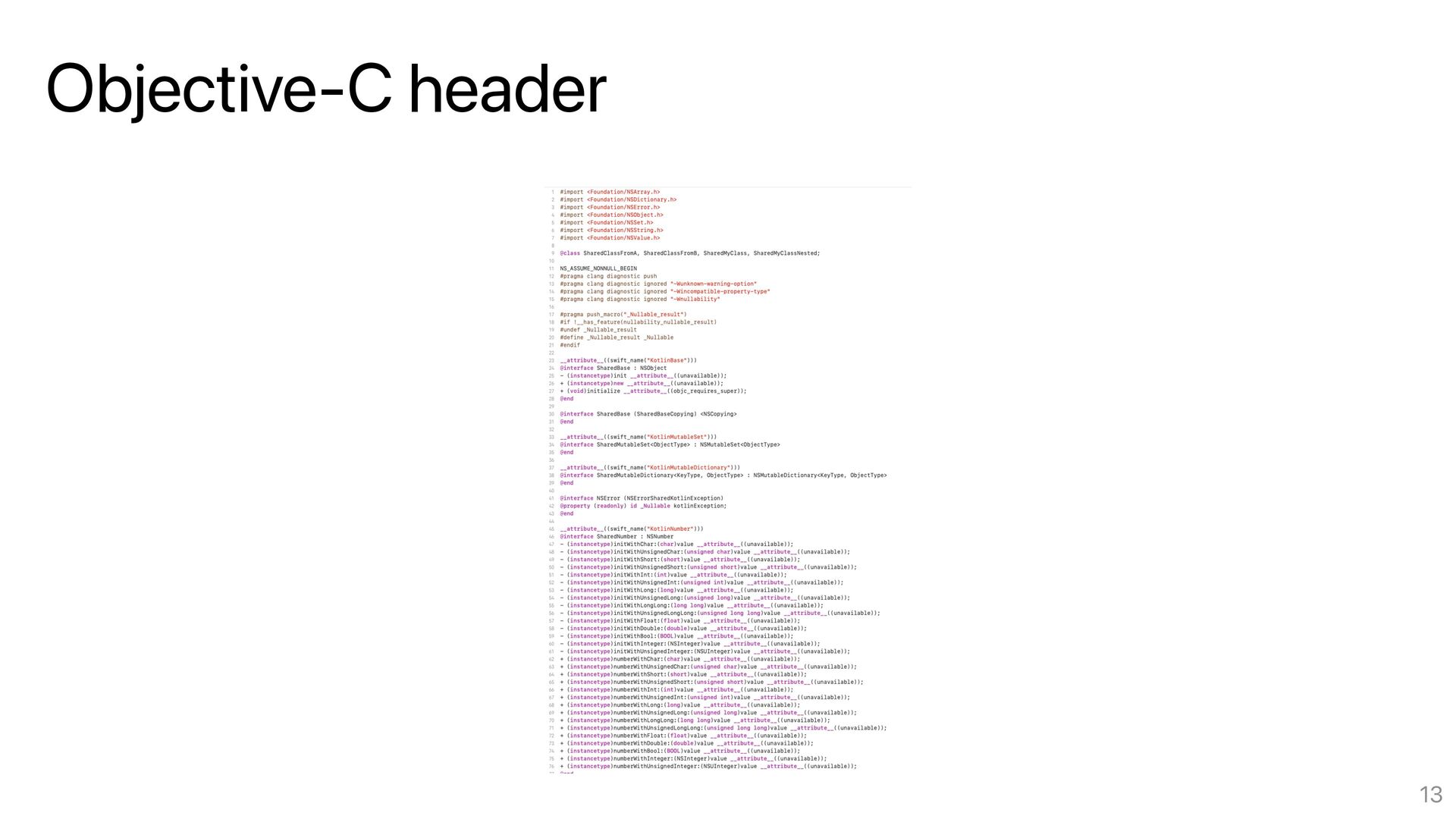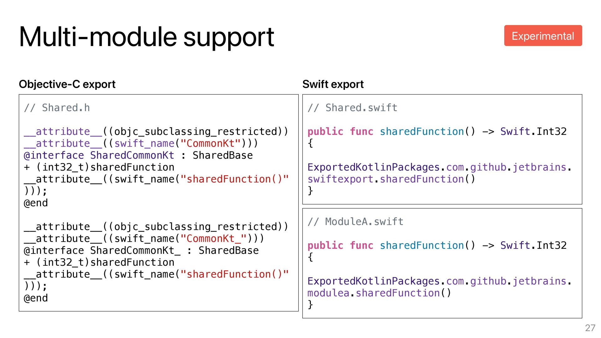 SharedCommonKt : SharedBase + (int32_t)sharedFunction __attribute__((swift_name("sharedFunction()" ))); @end __attribute__((objc_subclassing_restricted)) __attribute__((swift_name("CommonKt_"))) @interface SharedCommonKt_ : SharedBase + (int32_t)sharedFunction __attribute__((swift_name("sharedFunction()" ))); @end Swift export // Shared.swift public func sharedFunction() -> Swift.Int32 { ExportedKotlinPackages.com.github.jetbrains. swiftexport.sharedFunction() } // ModuleA.swift public func sharedFunction() -> Swift.Int32 { ExportedKotlinPackages.com.github.jetbrains. modulea.sharedFunction() } 27