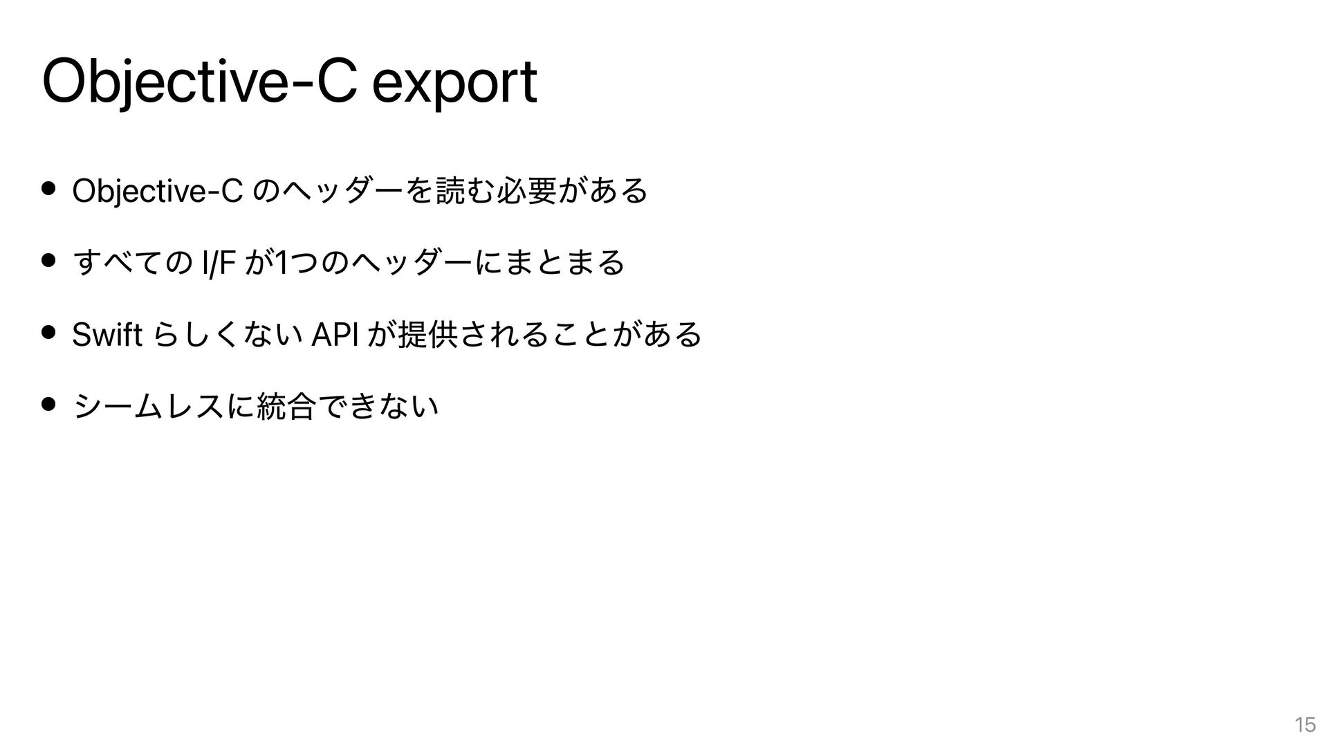 Objective-C export Objective-C ͷϔομʔΛಡΉඞཁ͕͋Δ ͯ͢ͷ I/F ͕1ͭͷϔομʔʹ·ͱ·Δ Swift Β͘͠ͳ͍ API