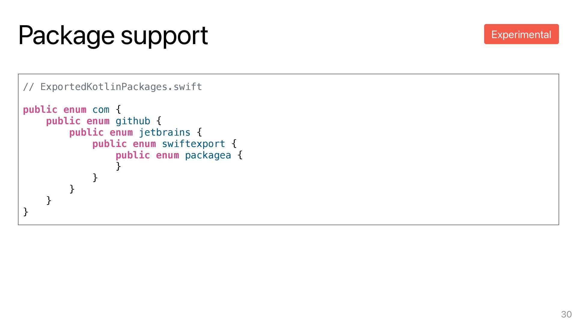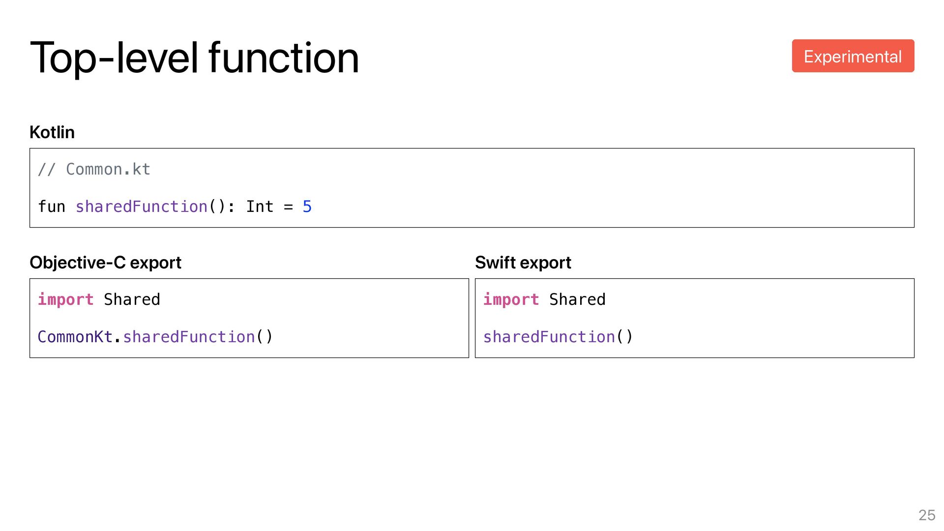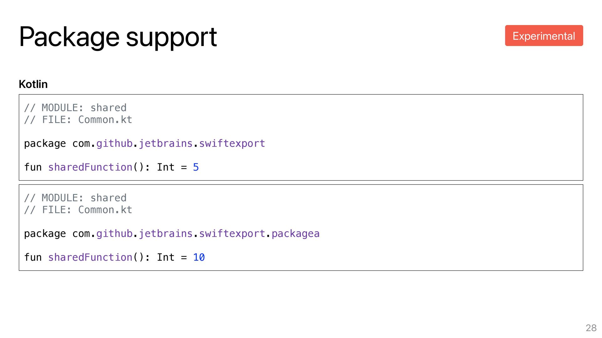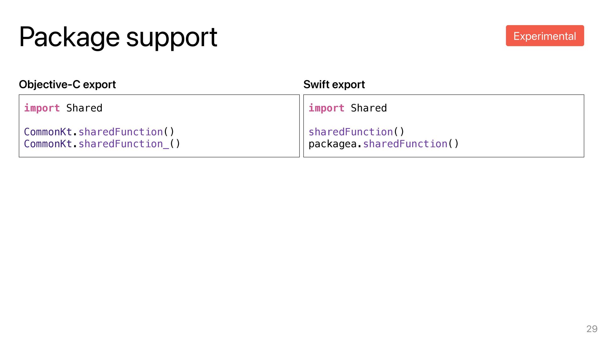 Package support Experimental Objective-C export import Shared CommonKt.sharedFunction() CommonKt.sharedFunction_() Swift