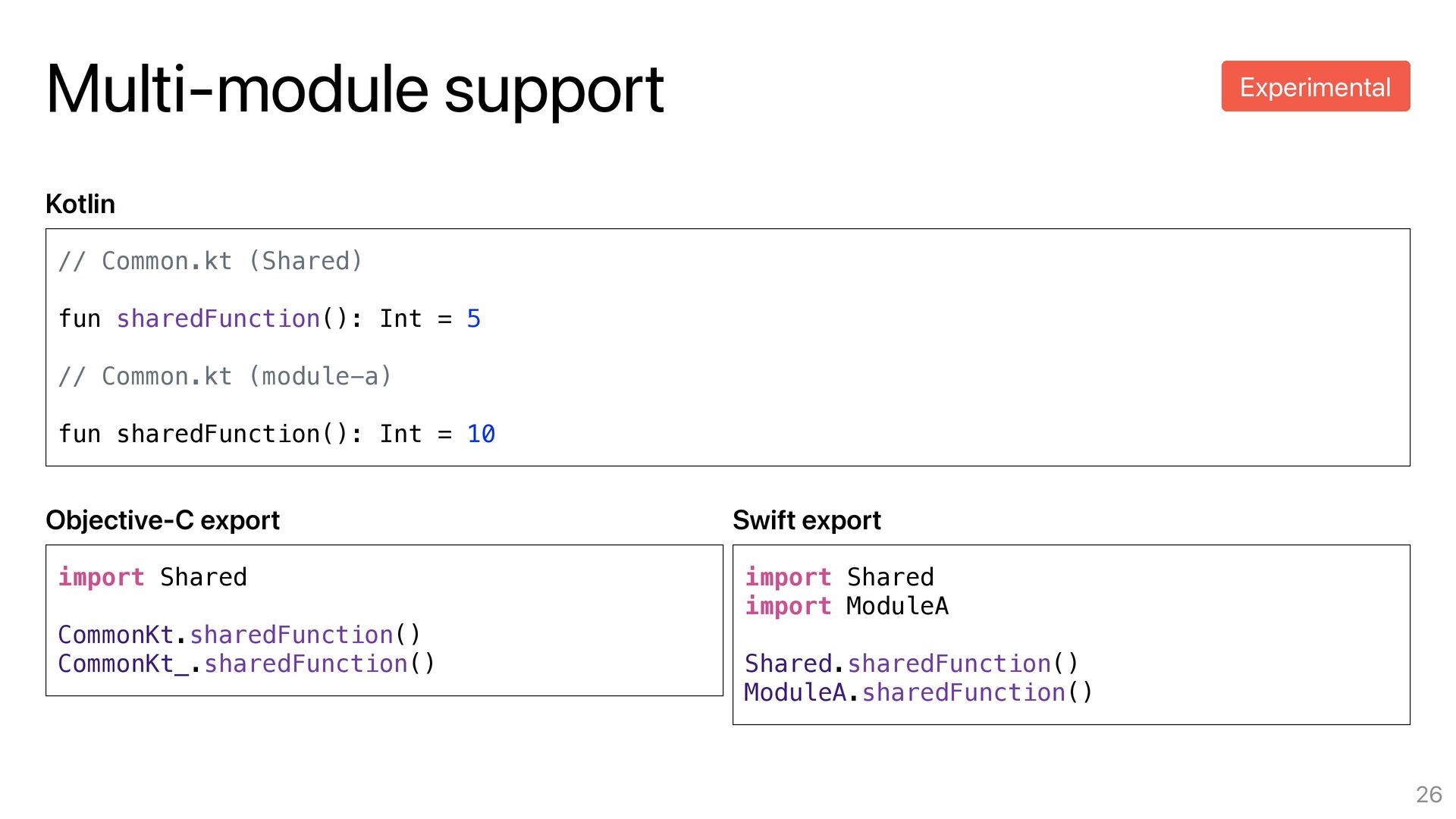 = 5 // Common.kt (module-a) fun sharedFunction(): Int = 10 Objective-C export import Shared CommonKt.sharedFunction() CommonKt_.sharedFunction() Swift export import Shared import ModuleA Shared.sharedFunction() ModuleA.sharedFunction() 26