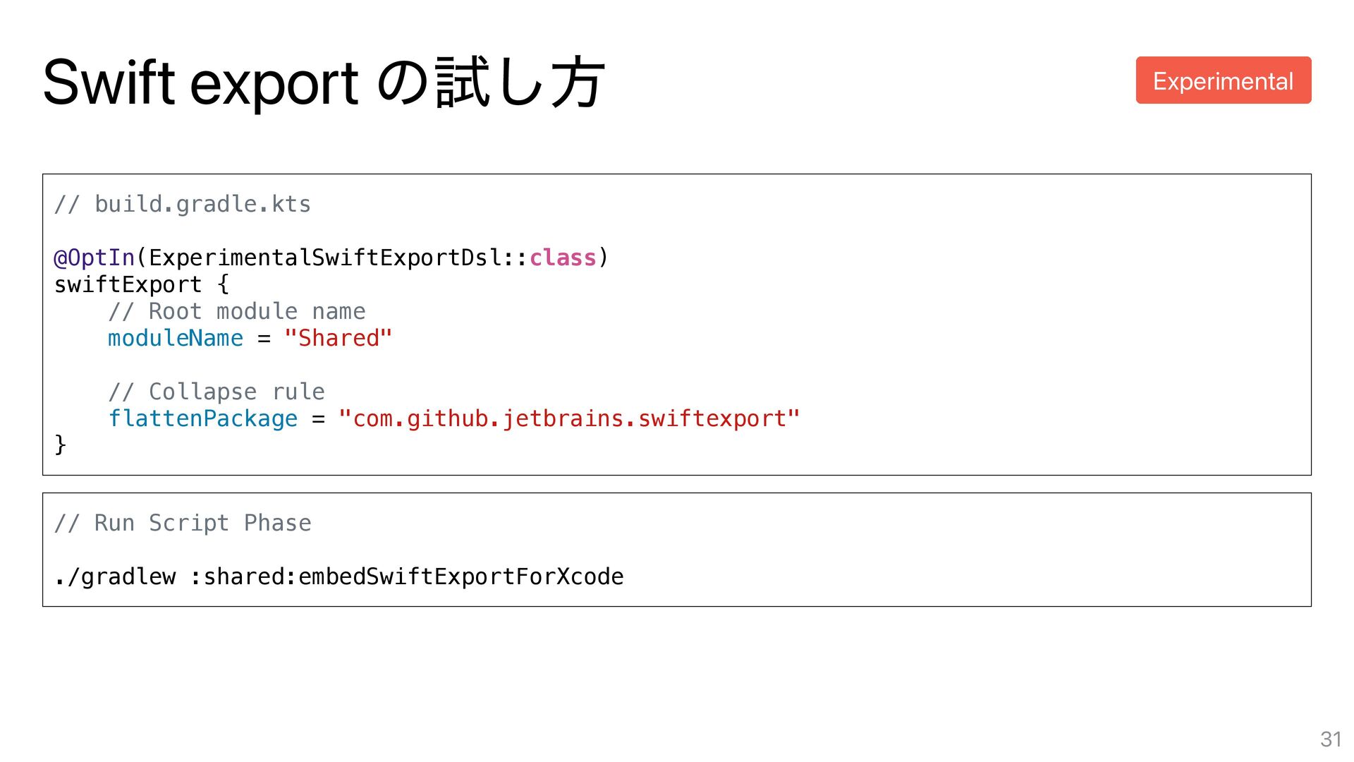 Swift export ͷࢼ͠ํ Experimental // build.gradle.kts @OptIn(ExperimentalSwiftExportDsl::class) swiftExport { //