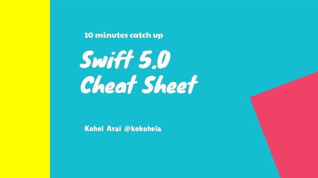 Enumへの@unknownの追加 18. リテラルを使った強制init 19. Dynamically callable 20. compilation conditionsの 未満オプション 21. Identity keypath 22. try?のオプショナル構造の簡 略化 2. 標準ライブラリのアップデート 1. Stringの特殊文字 2. Unicode Property 3. 型名の変更 4. Never型のプロトコル準拠 5. ContactValueMapの追加 6. Character Propertiesの追加 7. isMultipleの追加 8. 文字列補間のカスタマイズ 9. SIMD Vectorsの追加 10. カスタマイゼーションポイントの除外 11. Numericプロトコルの修正 12. Sequence.SubSequenceの消去 13. Result型の追加 14. withContiguous{Mutable}StorageIf Availableの追加 15. RangeのCodableへの準拠 16. StringのencodedOffsetの廃止 Table of Contents Swift 5.0 Cheet Sheet - Kohei Arai @kokoheia