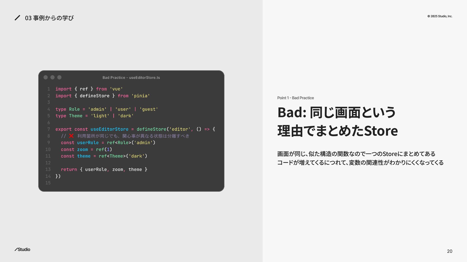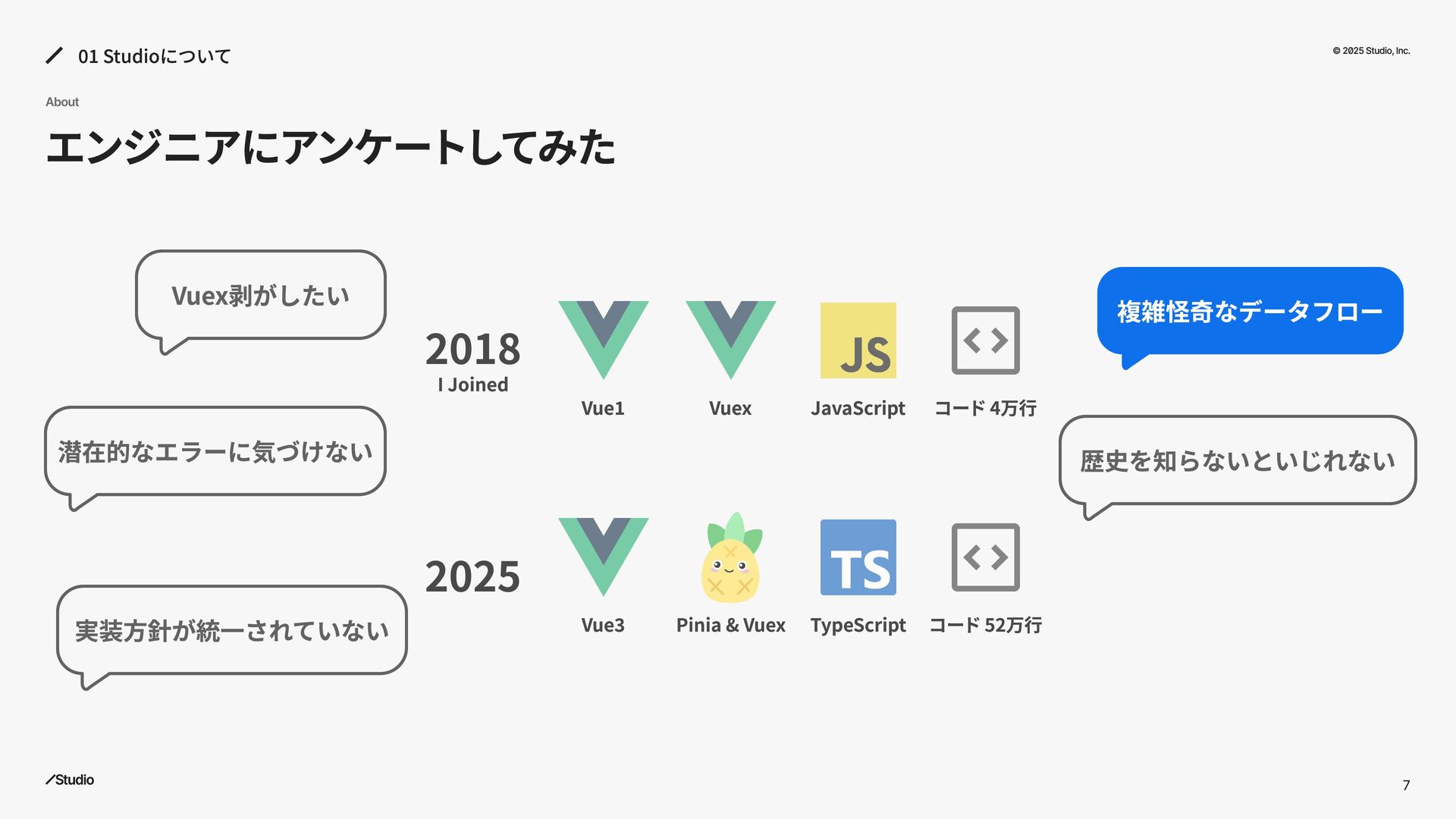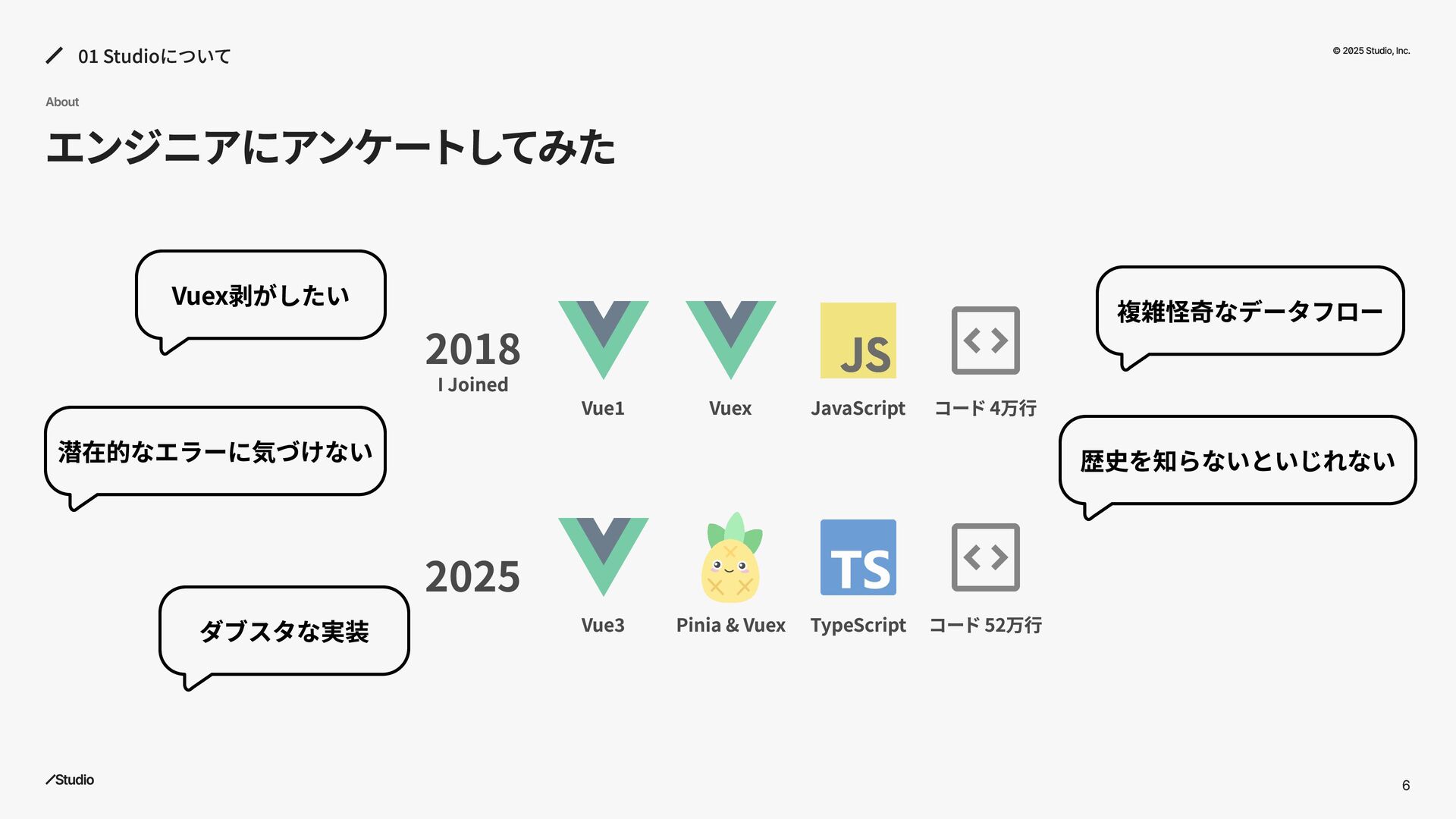 8年間にわたるVue.jsプロジェクトの運用を通して見えてきた、Store設計・データフローの複雑化・型定義の課題を整理し、SOLID原則(SRP / DIP)をベースにしたシンプルな設計の考え方を紹介しています。