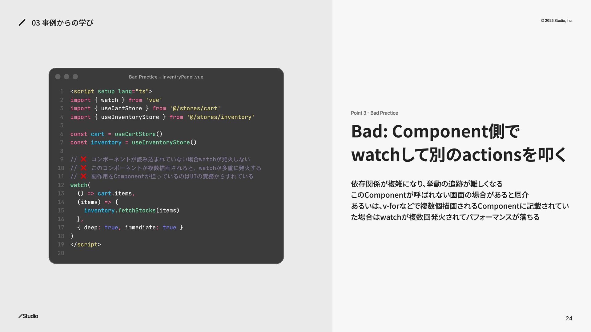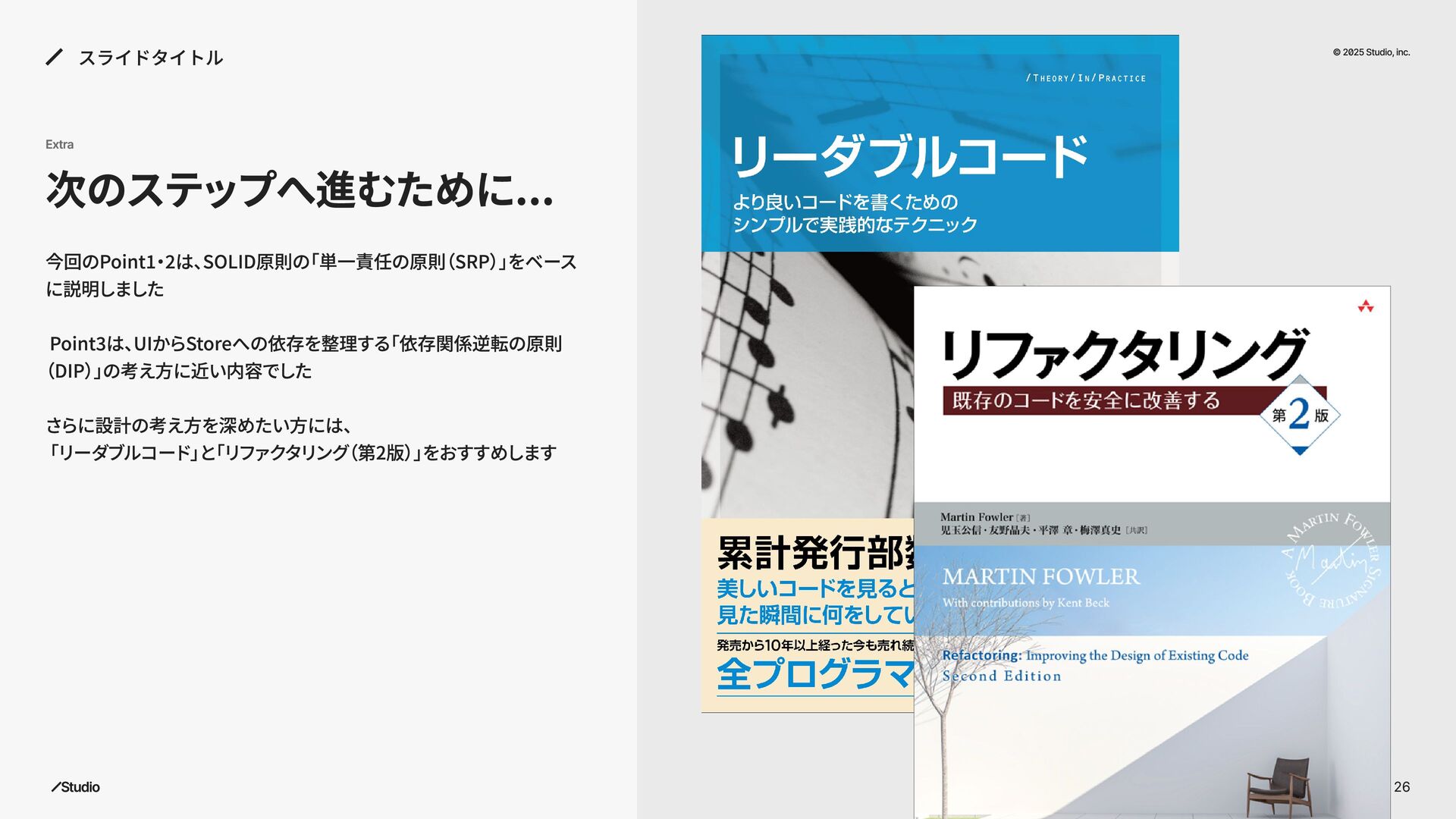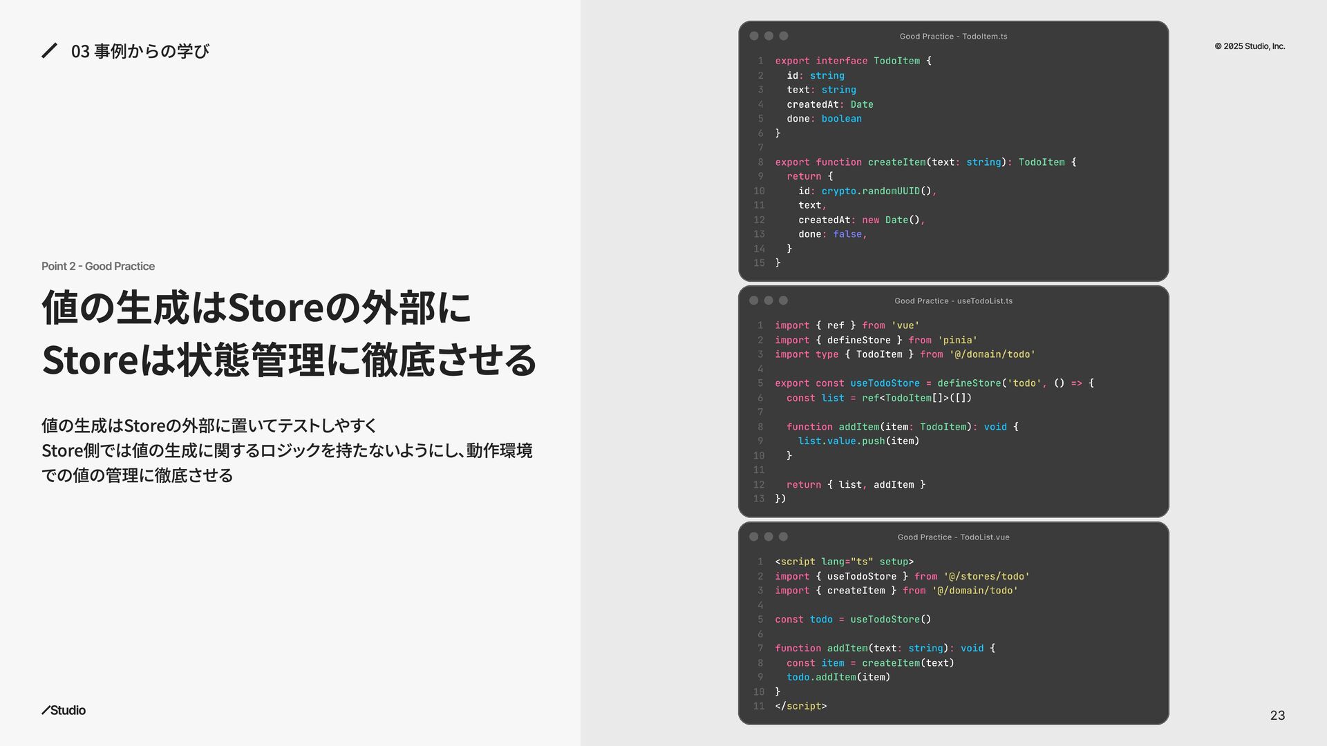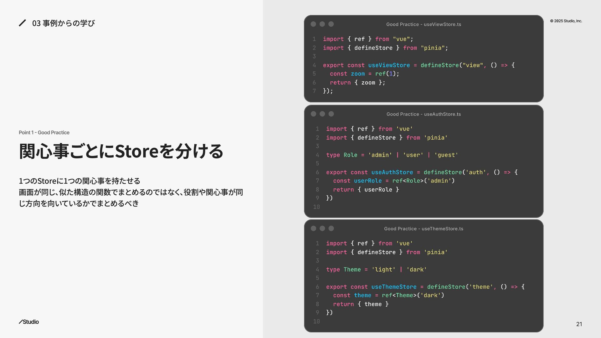 8年間にわたるVue.jsプロジェクトの運用を通して見えてきた、Store設計・データフローの複雑化・型定義の課題を整理し、SOLID原則(SRP / DIP)をベースにしたシンプルな設計の考え方を紹介しています。