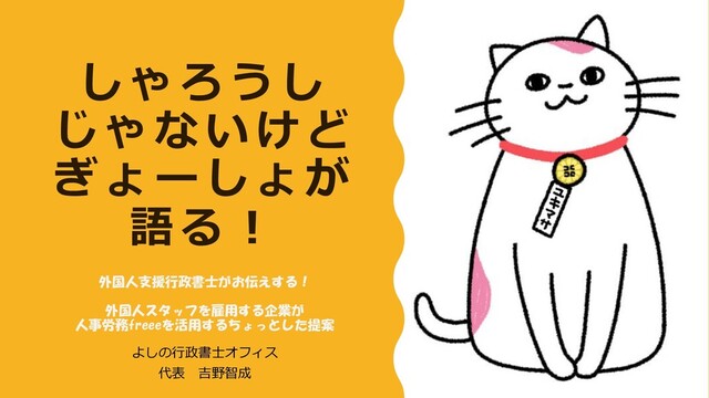 しゃろうし じゃないけど ぎょーしょが 語る! よしの行政書士オフィス 代表 吉野智成 外国人支援行政書士がお伝えする! 外国人スタッフを雇用する企業が 人事労務freeeを活用するちょっとした提案