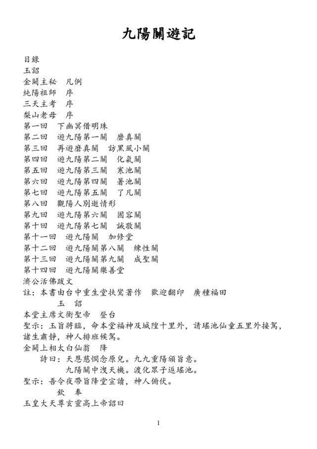 衲累壞了,以往甚少到爾重生堂來,希諸子及重修勿見怪也。 重修曰:師尊言重了!弟子等知您為了普渡眾生不辭勞苦奔走,在此一 末法之際,只是因本堂緣淺,因此師尊未能常蒞堂來開示也。 濟佛曰:重修不必酸溜溜了,重生堂如今已應運,著作此一曠古奇書, 闡述九陽關以補天堂、地獄之不足,實在是爾這幾年來辛苦所 得的代價,此一重任實是非輕,希爾能盡心盡力,我們也好早 日完書覆命。 重修曰:弟子當盡心盡力,不敢怠慢,認真向道,以不負上天所交待之 重責大任。 濟佛曰:九陽關遊記乙書如果發行,重修,爾當可在鸞堂歷史上揚名立 萬。 重修曰:弟子只求在此世能多行善功,早日證果永不輪迴,則此心願即 足矣! 濟佛曰:嘿!看起來這個世上大概是住久而住怕了。 重修曰:是有一點倦了,只是深知任務未了,不敢放鬆罷了。 濟佛曰:莫再嘆苦經了,著作奇書乃是千百年難得的機。也不是人人可 得的呢! 重修曰:對了,師尊,九陽關到底是什麼地方呢?有何作用呢? 濟佛曰:天堂乃是鼓勵原人認真向道,將來證果之仙境;而地獄乃是警 惕世人,莫作奸惡邪淫之事。可是對於功多過少之修行人,地 獄所設之刑法,就不能用了。 重修曰:噢!為什麼呢?功多過少不就可以直登仙境了嗎? 濟佛曰:不然!地獄之刑罰乃是對邪惡之人施以懲罰,但是修行之人, 因其惡行未達地府拘禁之標準雖然功多過少,但上天乃是要一 個全真至聖的修行人,因此一個修行者的後天習氣未除,則仙 4