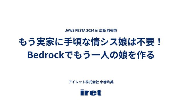 もう実家に⼿頃な情シス娘は不要! Bedrockでもう⼀⼈の娘を作る JAWS FESTA 2024 in 広島 前夜祭 アイレット株式会社 ⼩巻玖美