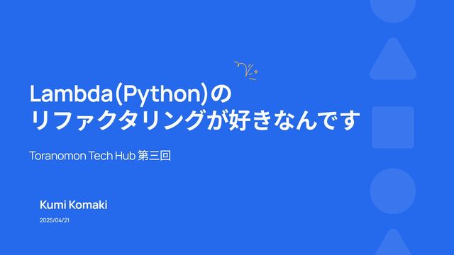 Lambda(Python)の リファクタリングが好きなんです Toranomon Tech Hub 第三回 Kumi Komaki 2025/04/21
