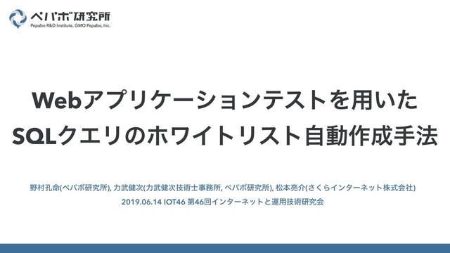 ଜ໋(ϖύϘݚڀॴ), ྗ݈࣍(ྗ݈ٕ࣍ज़࢜ࣄॴ, ϖύϘݚڀॴ), দຊ྄հ(͘͞ΒΠϯλʔωοτגࣜձࣾ) 2019.06.14 IOT46 ୈ46ճΠϯλʔωοτͱӡ༻ٕज़ݚڀձ WebΞϓϦέʔγϣϯςετΛ༻͍ͨ SQLΫΤϦͷϗϫΠτϦετࣗಈ࡞ख๏