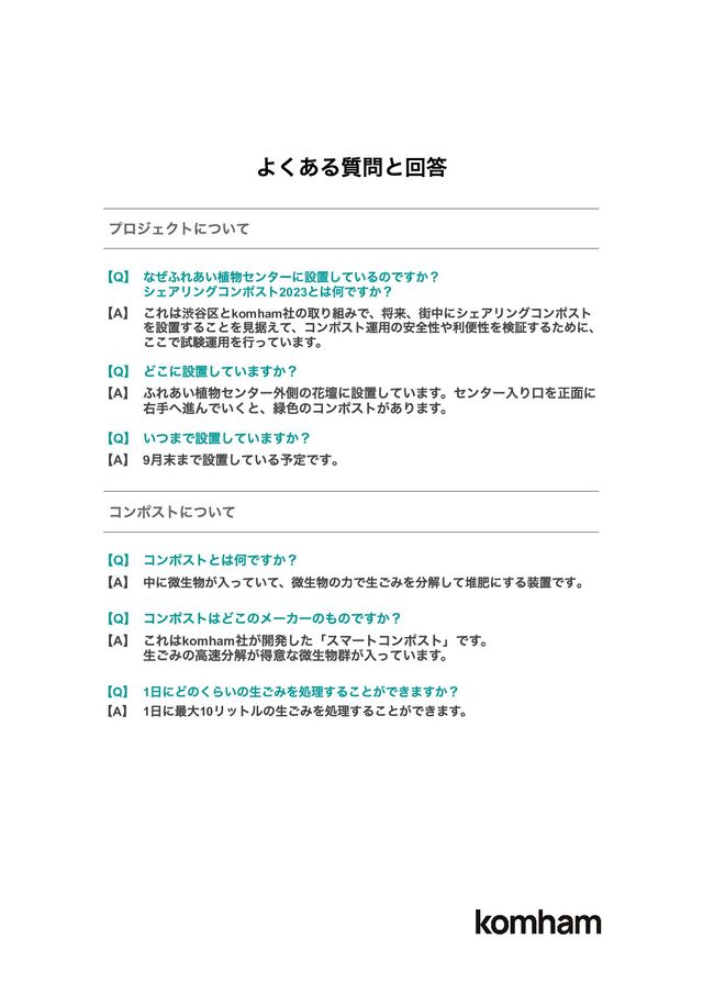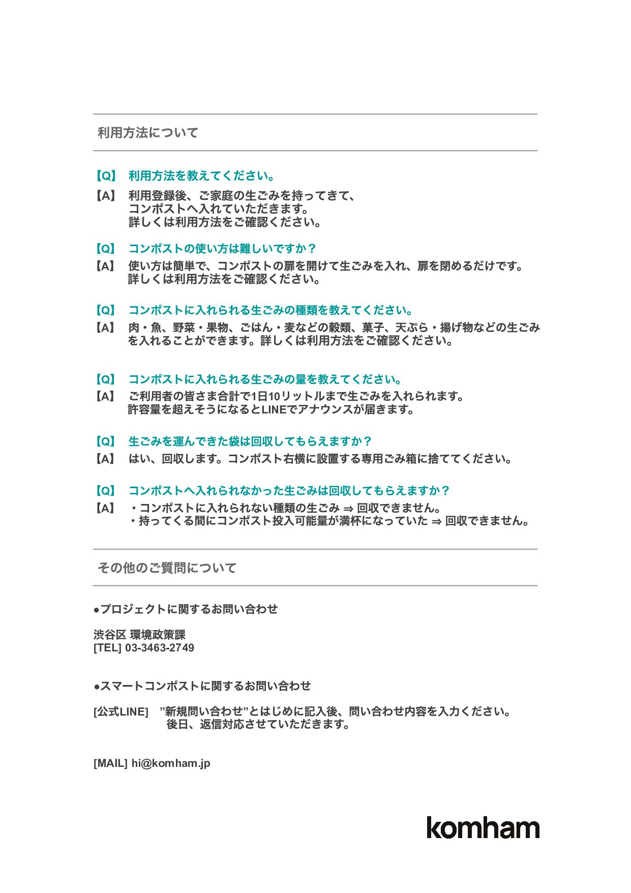 詳しくは利⽤⽅法をご確認ください。 【Q 】 コンポストの使い⽅は難しいですか? 【A 】 使い⽅は簡単で、コンポストの扉を開けて⽣ごみを⼊れ、扉を閉めるだけです。 詳しくは利⽤⽅法をご確認ください。 【Q 】 コンポストに⼊れられる⽣ごみの種類を教えてください。 【A 】 ⾁・⿂、野菜・果物、ごはん・⻨などの穀類、菓⼦、天ぷら・揚げ物などの⽣ごみ を⼊れることができます。 詳しくは利⽤⽅法をご確認ください。 【Q 】 コンポストに⼊れられる⽣ごみの量を教えてください。 【A 】 ご利⽤者の皆さま合計で1 ⽇10 リットルまで⽣ごみを⼊れられます。 許容量を超えそうになるとLINE でアナウンスが届きます。 【Q 】 ⽣ごみを運んできた袋は回収してもらえますか? 【A 】 はい、回収します。コンポスト右横に設置する専⽤ごみ箱に捨ててください。 【Q 】 コンポストへ⼊れられなかった⽣ごみは回収してもらえますか? 【A 】 ・コンポストに⼊れられない種類の⽣ごみ ⇒ 回収できません。 ・持ってくる間にコンポスト投⼊可能量が満杯になっていた ⇒ 回収できません。 その他のご質問について • プロジェクトに関するお問い合わせ 渋⾕区 環境政策課 [TEL] 03-3463-2749 • スマートコンポストに関するお問い合わせ [ 公式LINE] ” 新規問い合わせ” とはじめに記⼊後、問い合わせ内容を⼊⼒ください。 後⽇、返信対応させていただきます。 [MAIL]