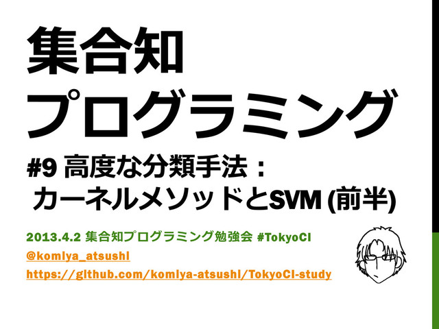 集合知 プログラミング #9 高度な分類手法: カーネルメソッドとSVM (前半) 2013.4.2 集合知プログラミング勉強会 #TokyoCI @komiya_atsushi