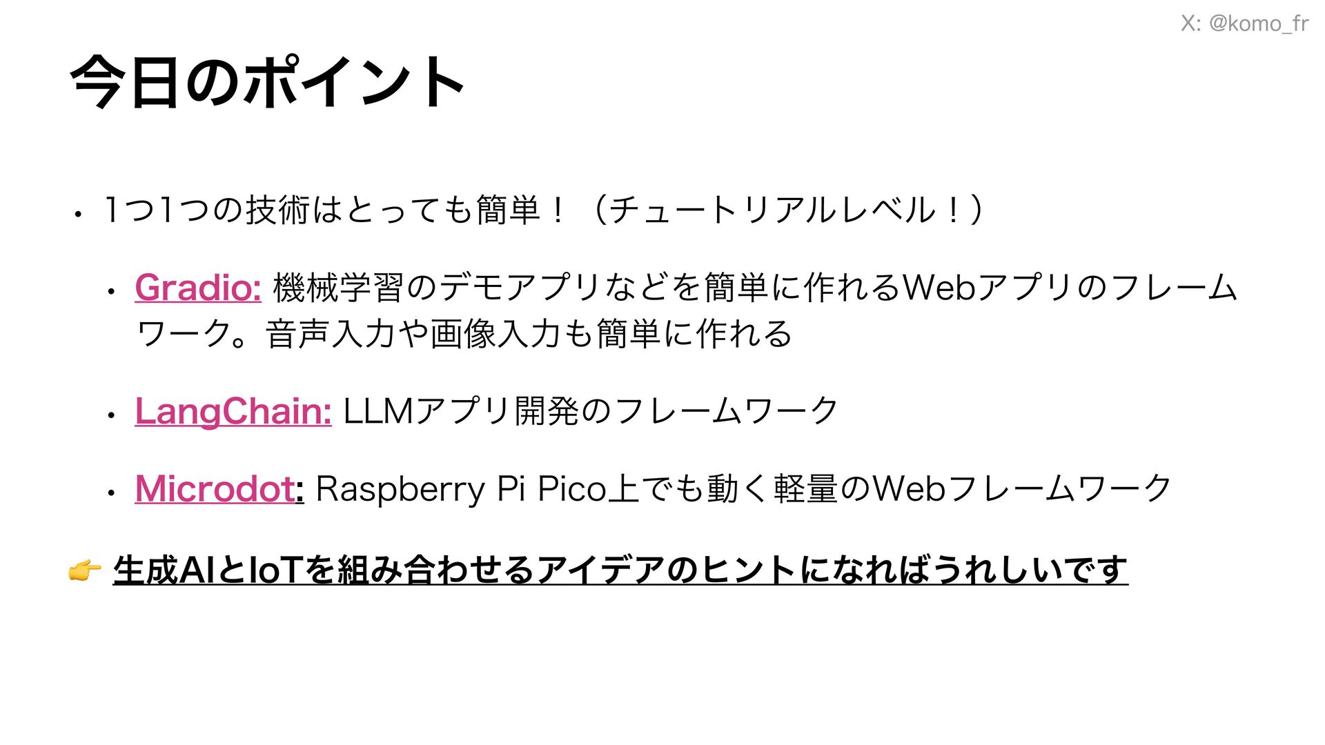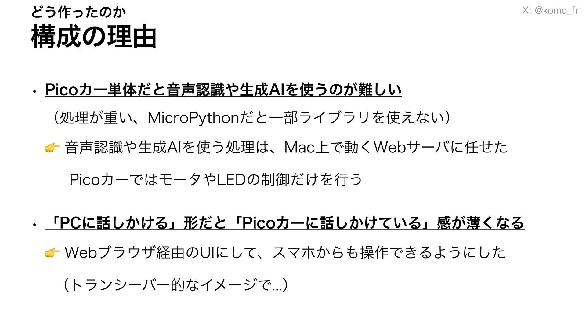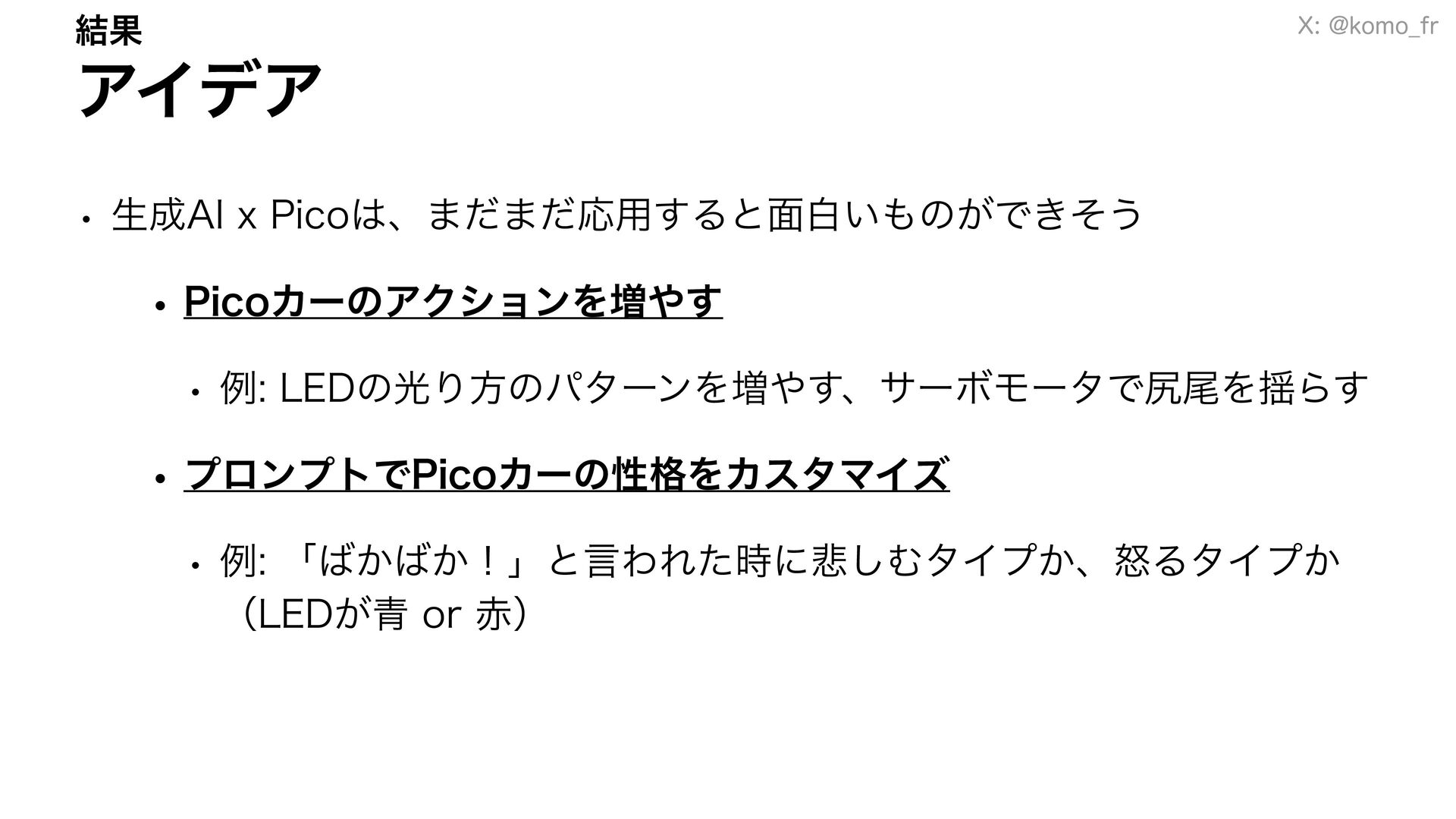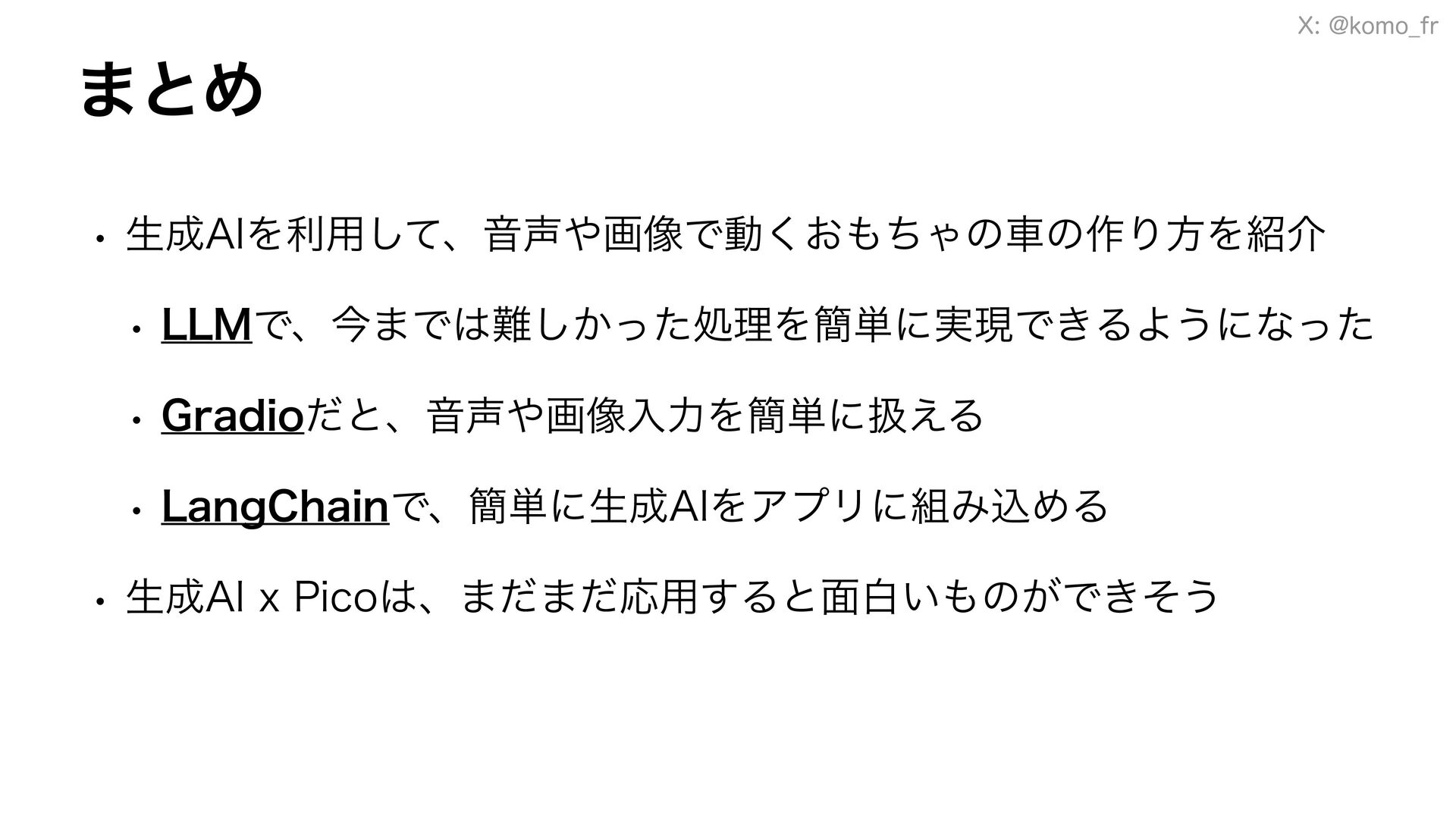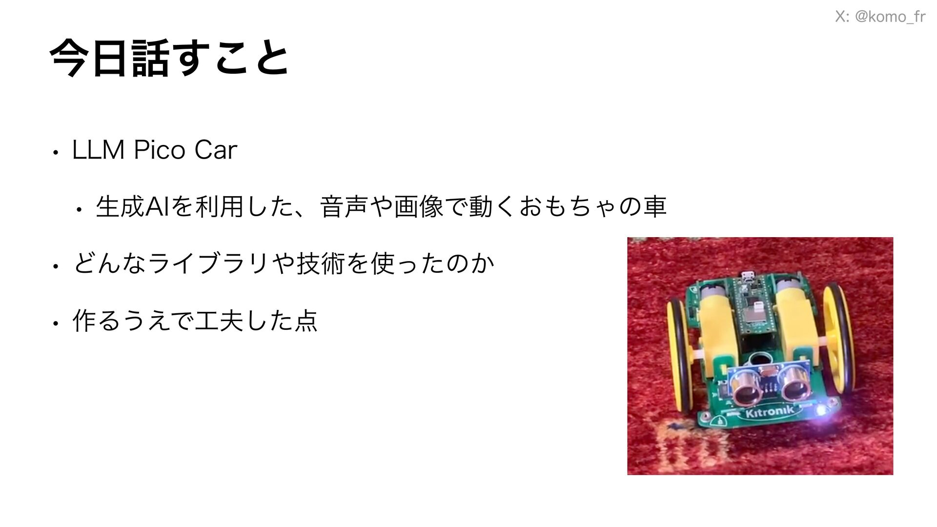 個人で気軽に試せる趣味プロジェクトの例として、生成AIを使った、音声や画像で操作できるRaspberry Pi Pico搭載の小さな車を紹介。実際のコードを交えて、仕組みや利用しているライブラリ(LangChain、Gradio、Microdot など)を説明しました。