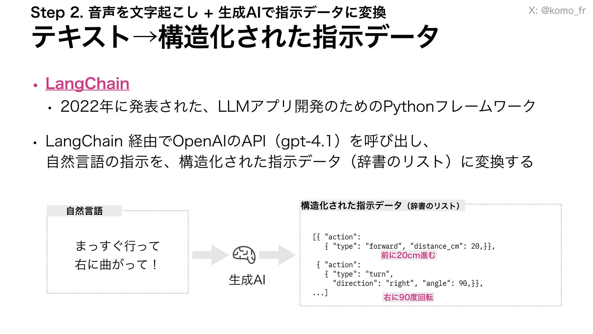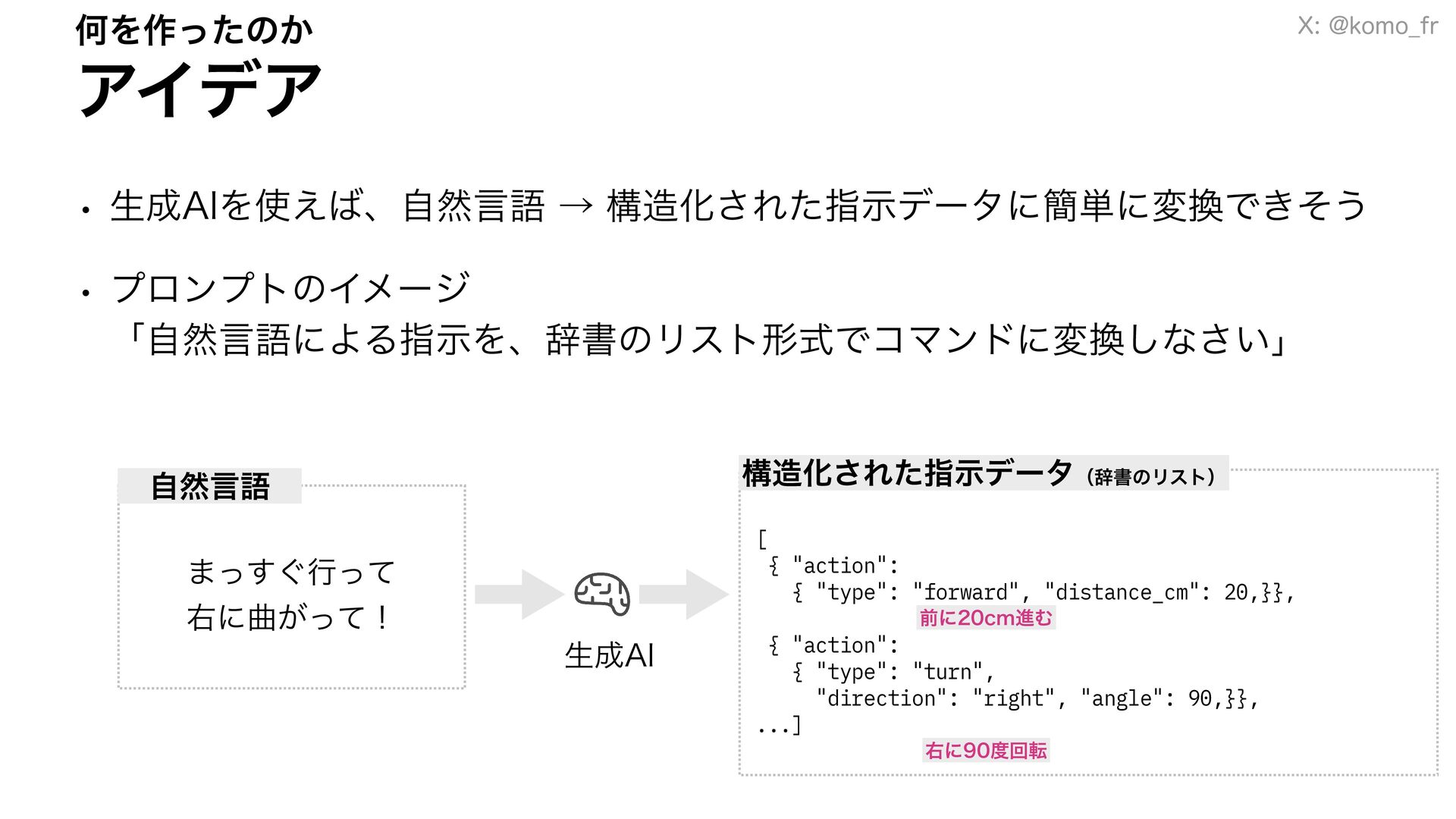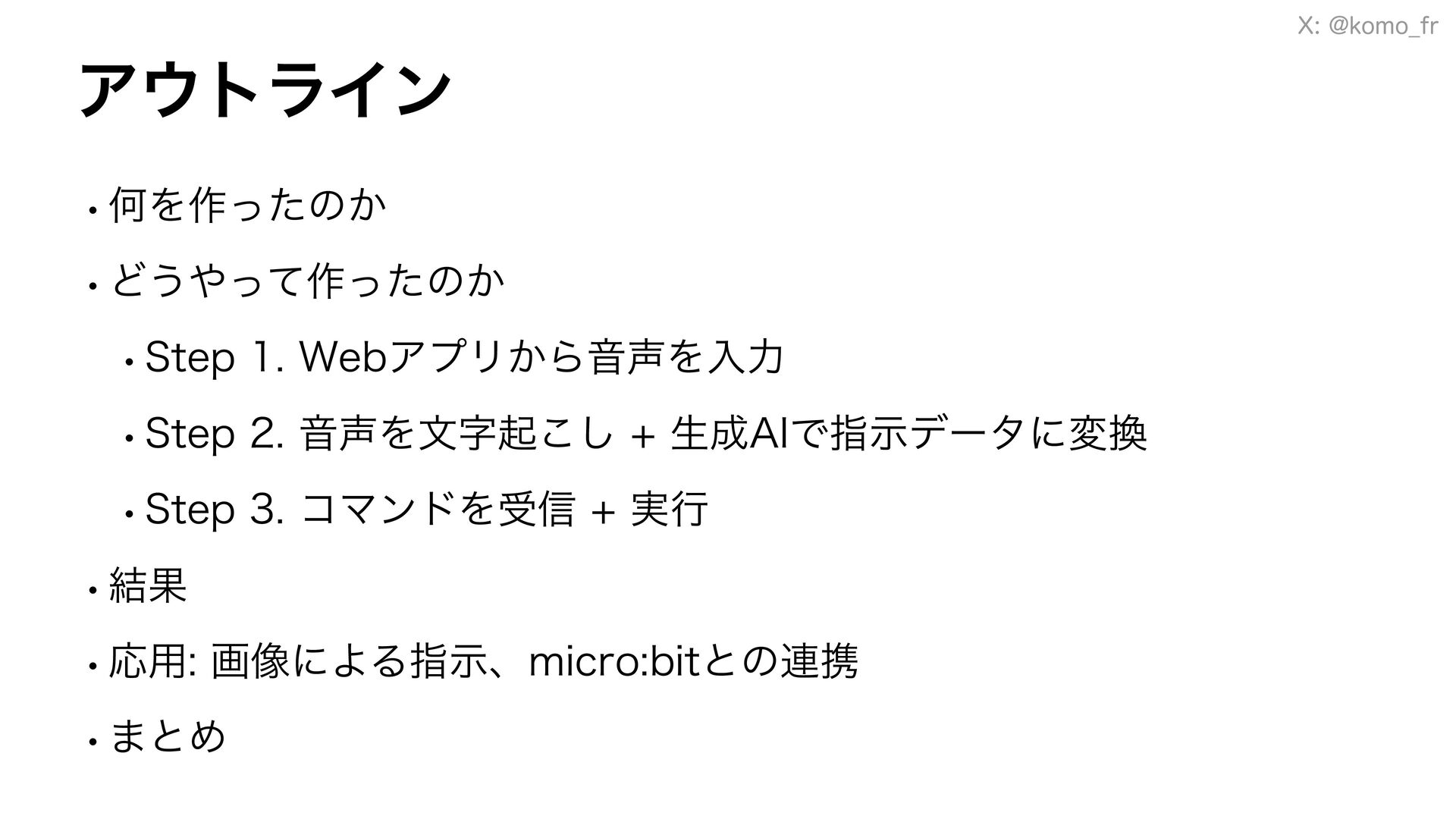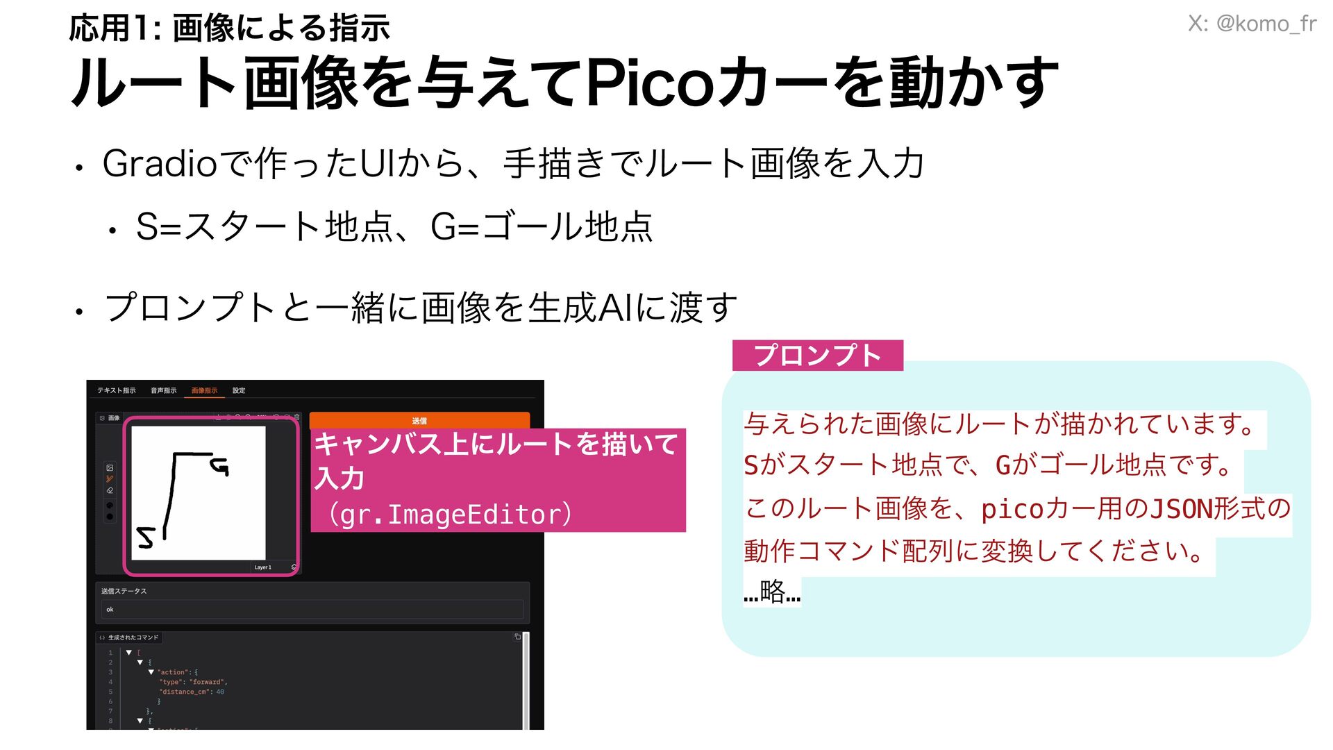 個人で気軽に試せる趣味プロジェクトの例として、生成AIを使った、音声や画像で操作できるRaspberry Pi Pico搭載の小さな車を紹介。実際のコードを交えて、仕組みや利用しているライブラリ(LangChain、Gradio、Microdot など)を説明しました。