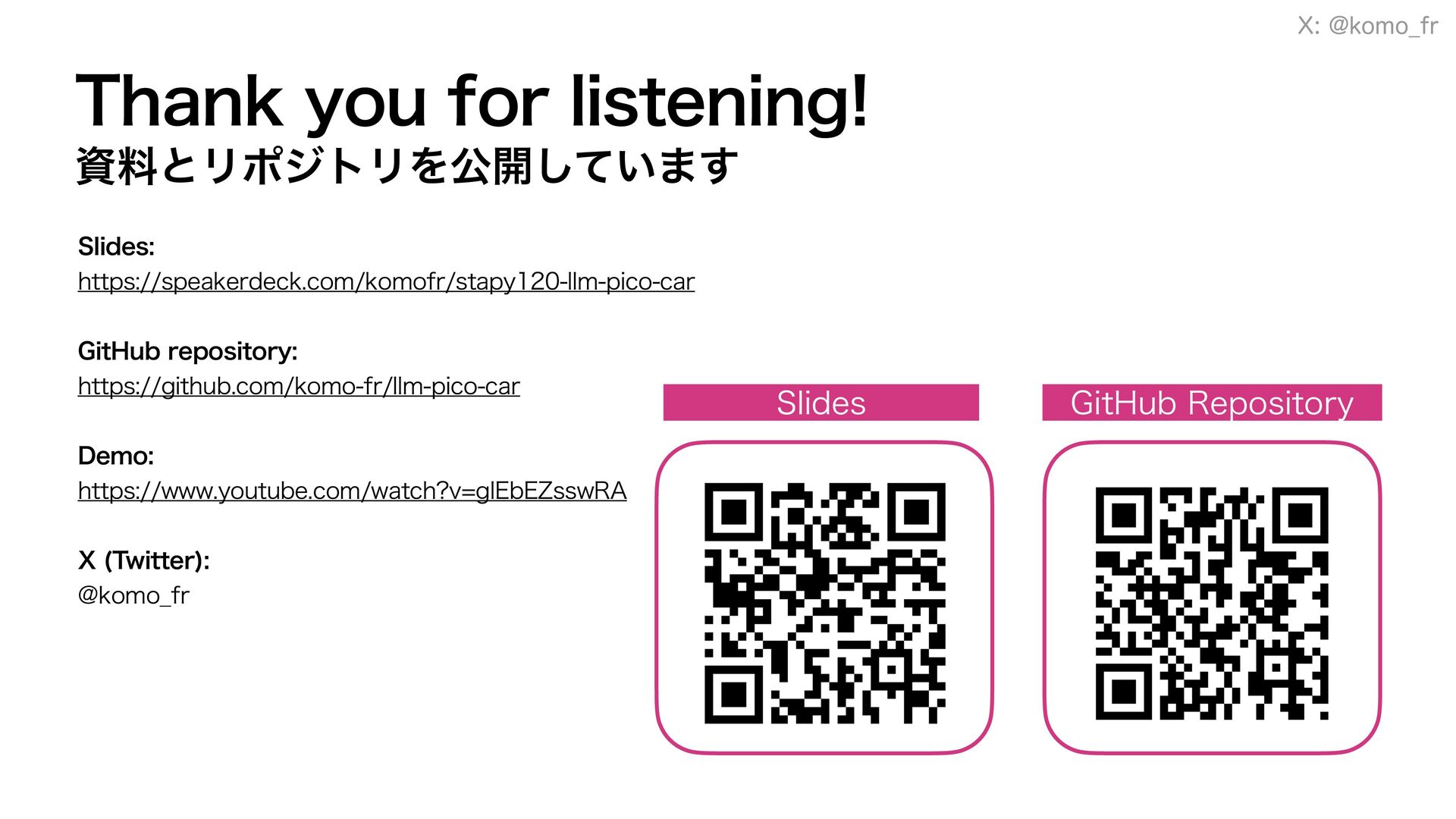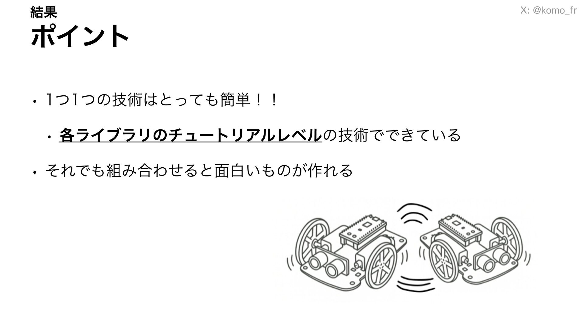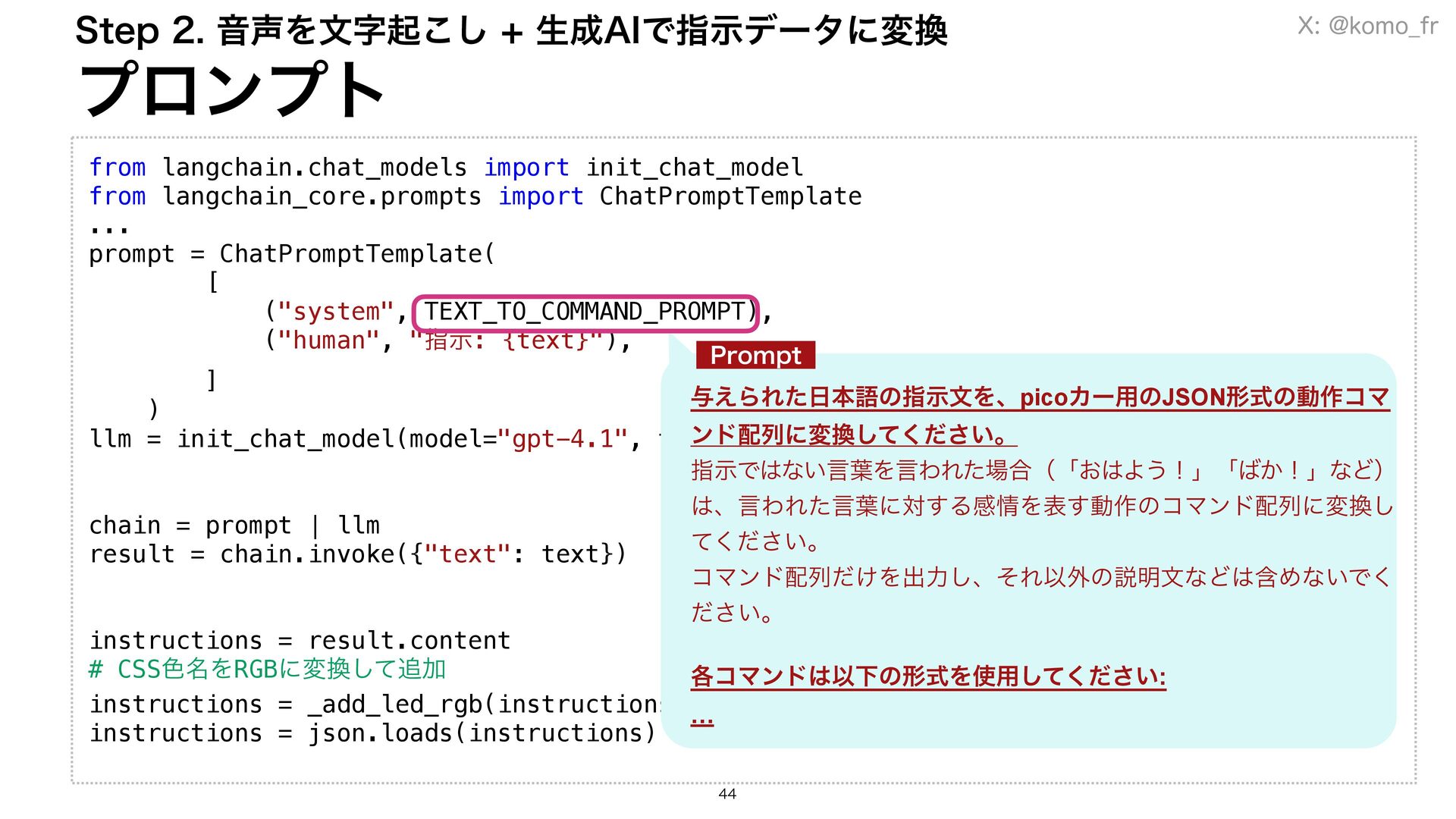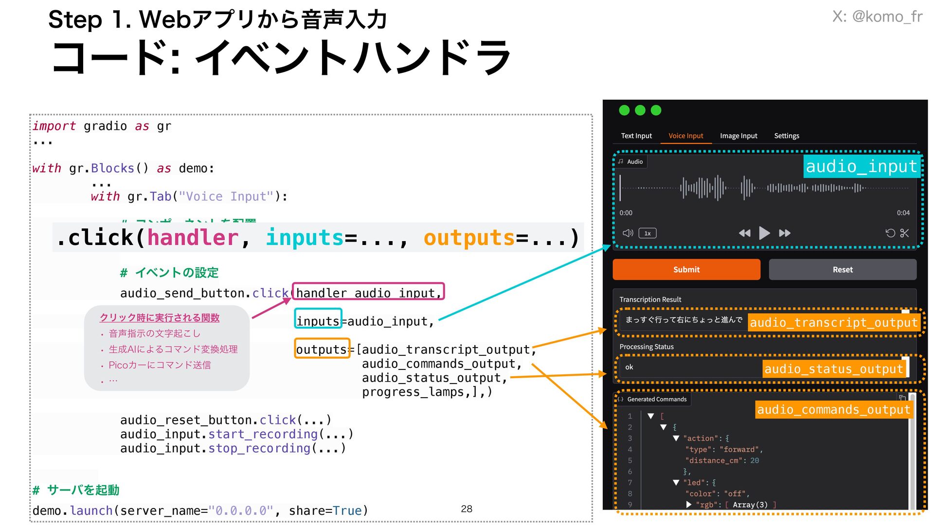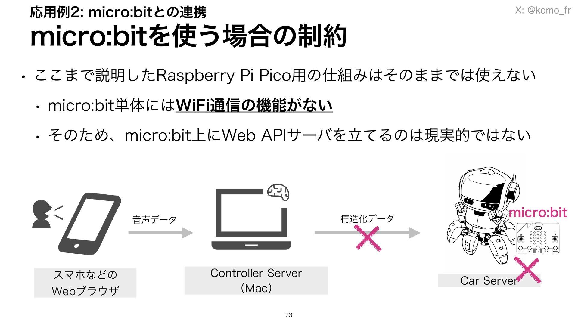 個人で気軽に試せる趣味プロジェクトの例として、生成AIを使った、音声や画像で操作できるRaspberry Pi Pico搭載の小さな車を紹介。実際のコードを交えて、仕組みや利用しているライブラリ(LangChain、Gradio、Microdot など)を説明しました。