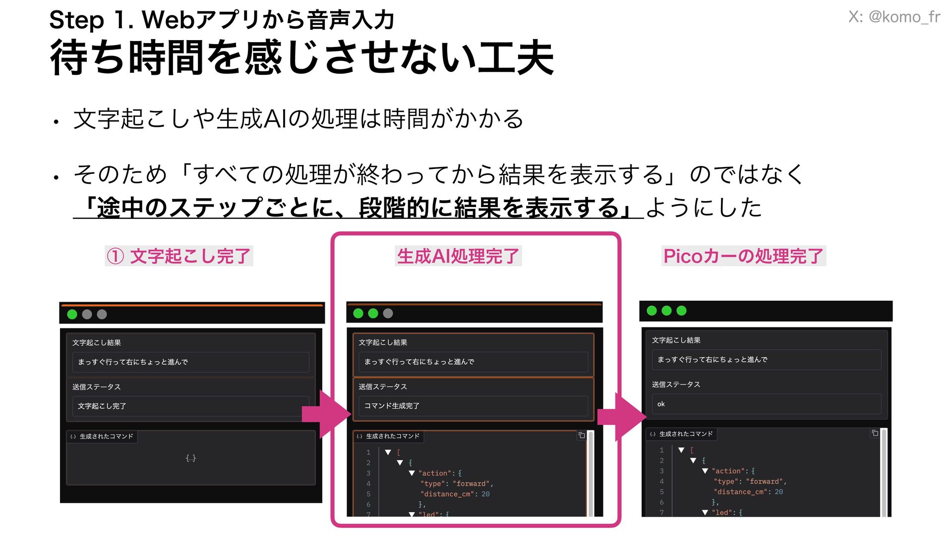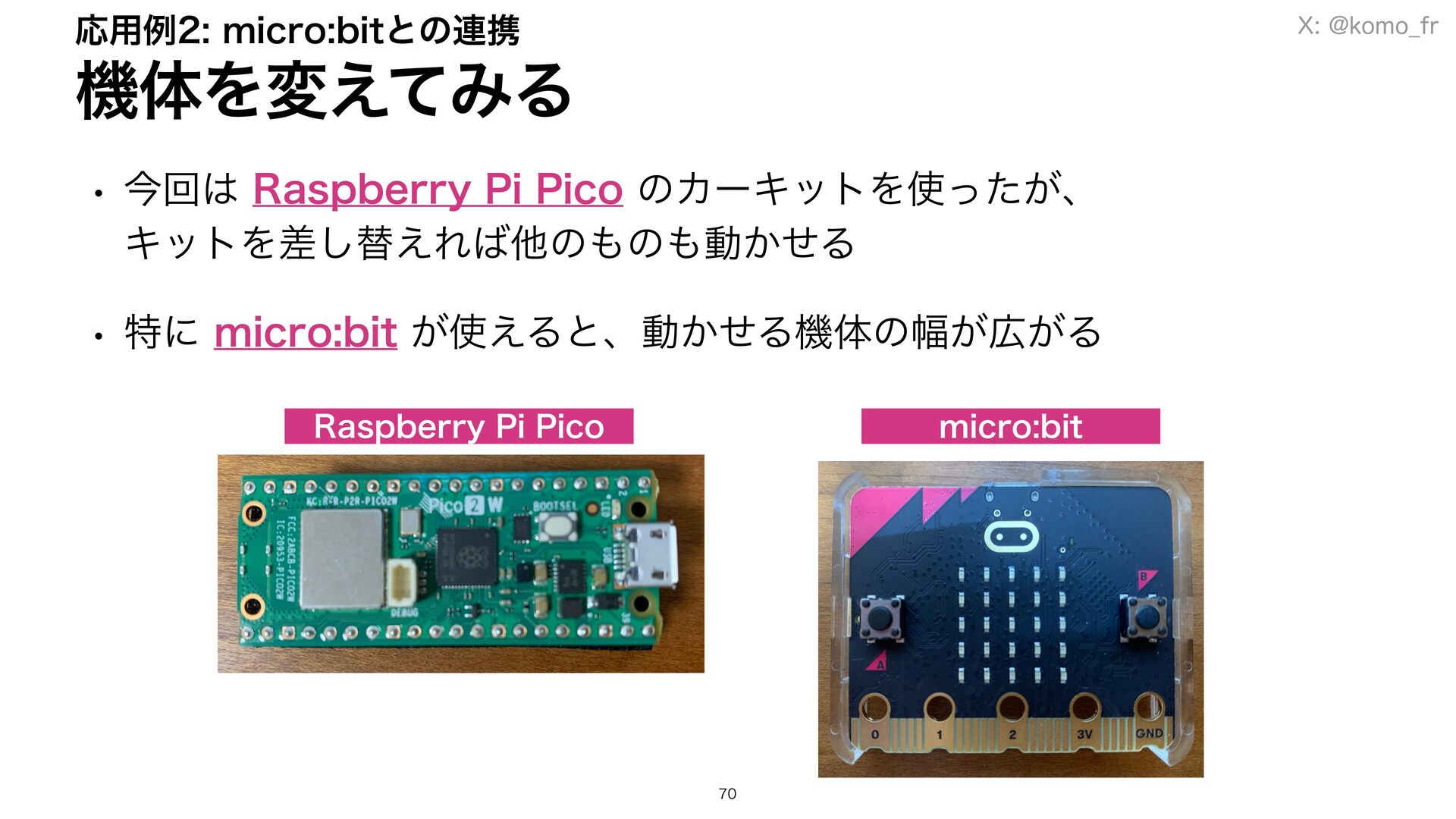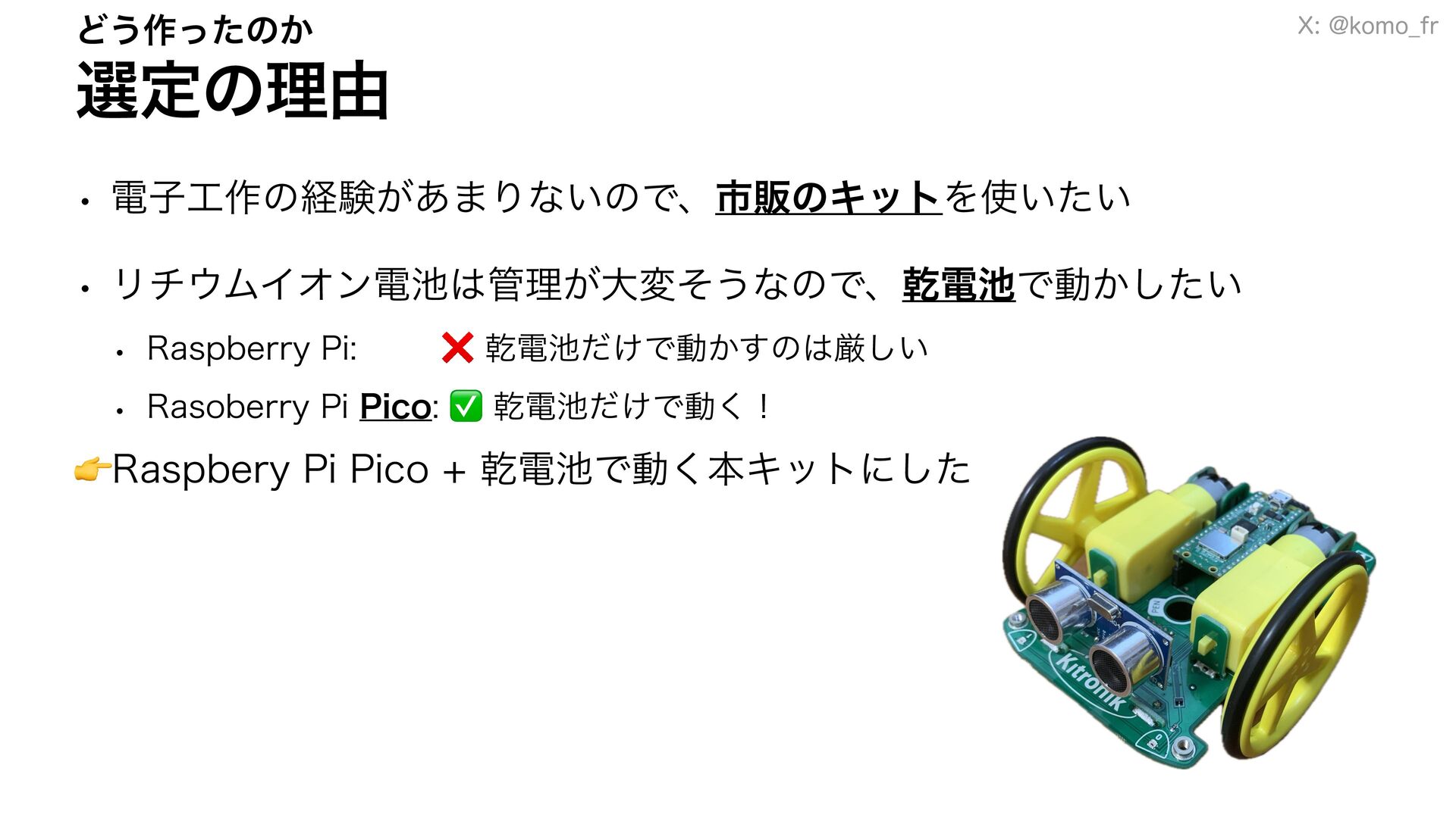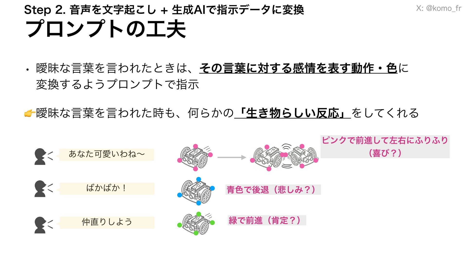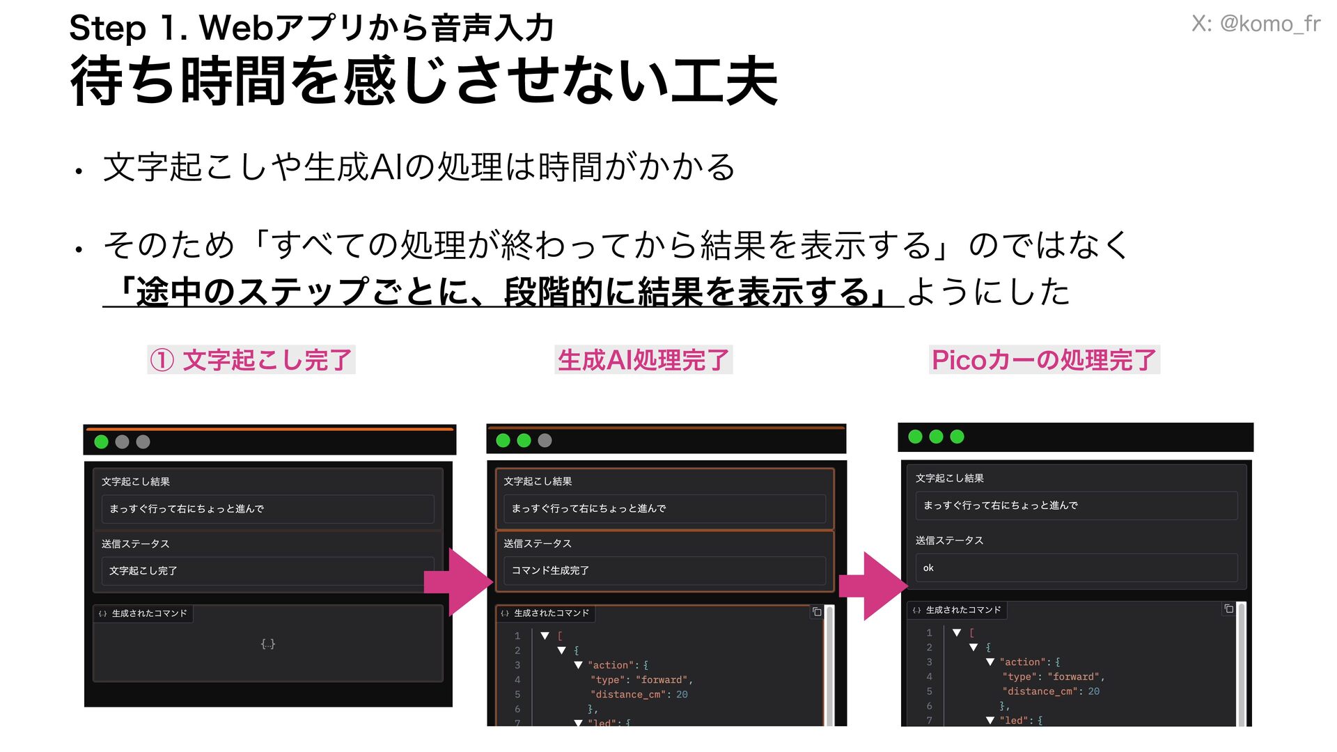 個人で気軽に試せる趣味プロジェクトの例として、生成AIを使った、音声や画像で操作できるRaspberry Pi Pico搭載の小さな車を紹介。実際のコードを交えて、仕組みや利用しているライブラリ(LangChain、Gradio、Microdot など)を説明しました。
