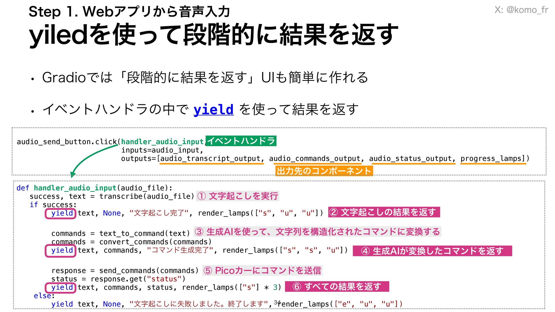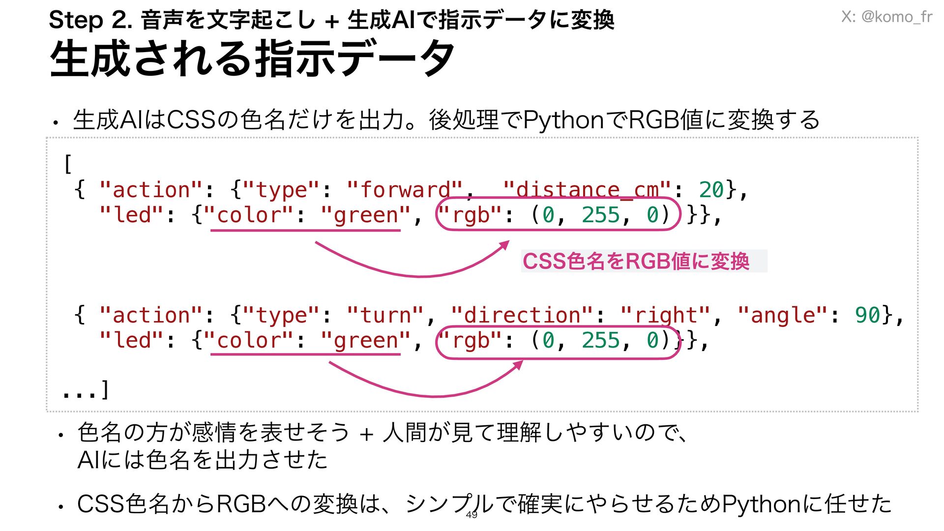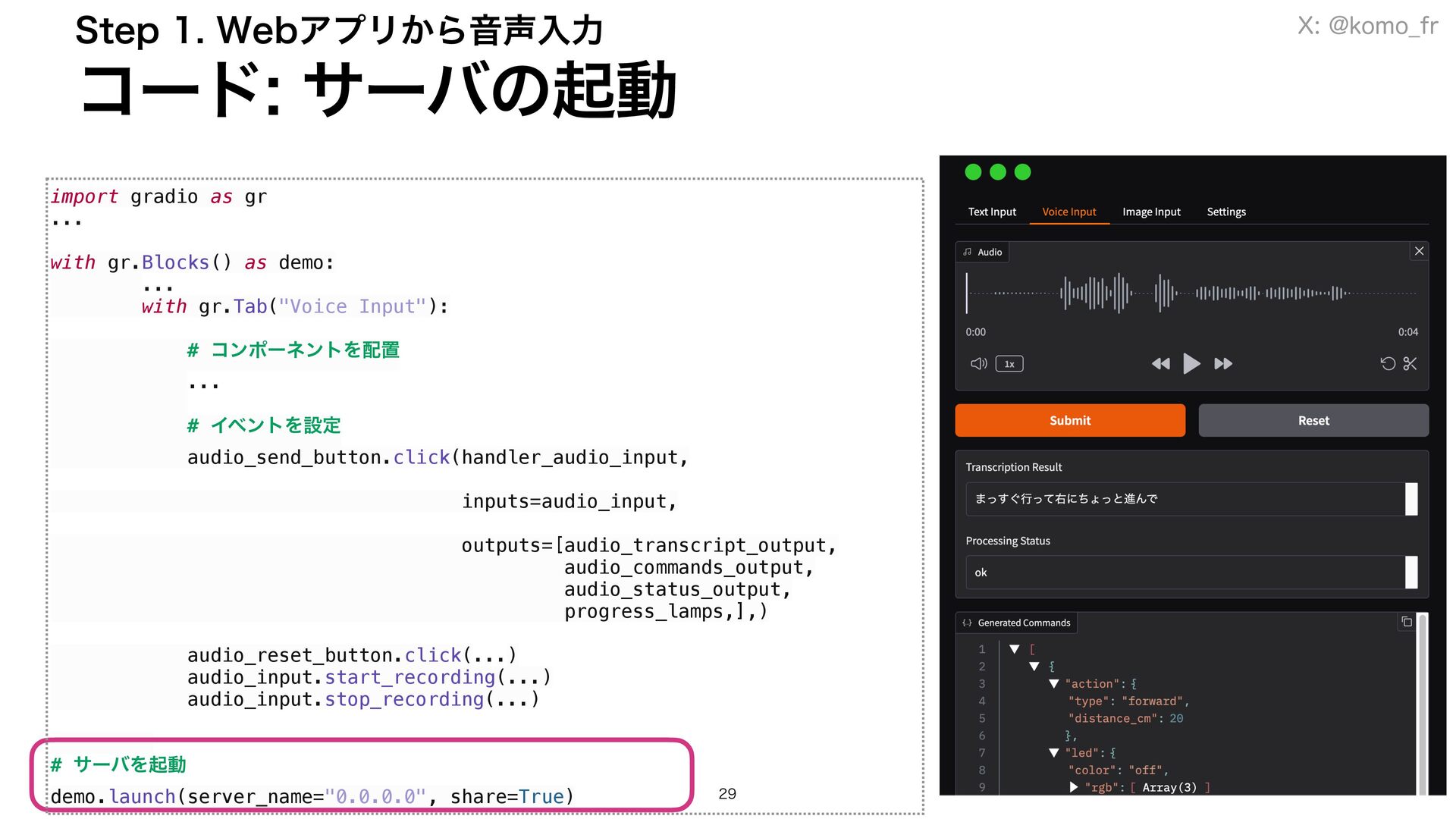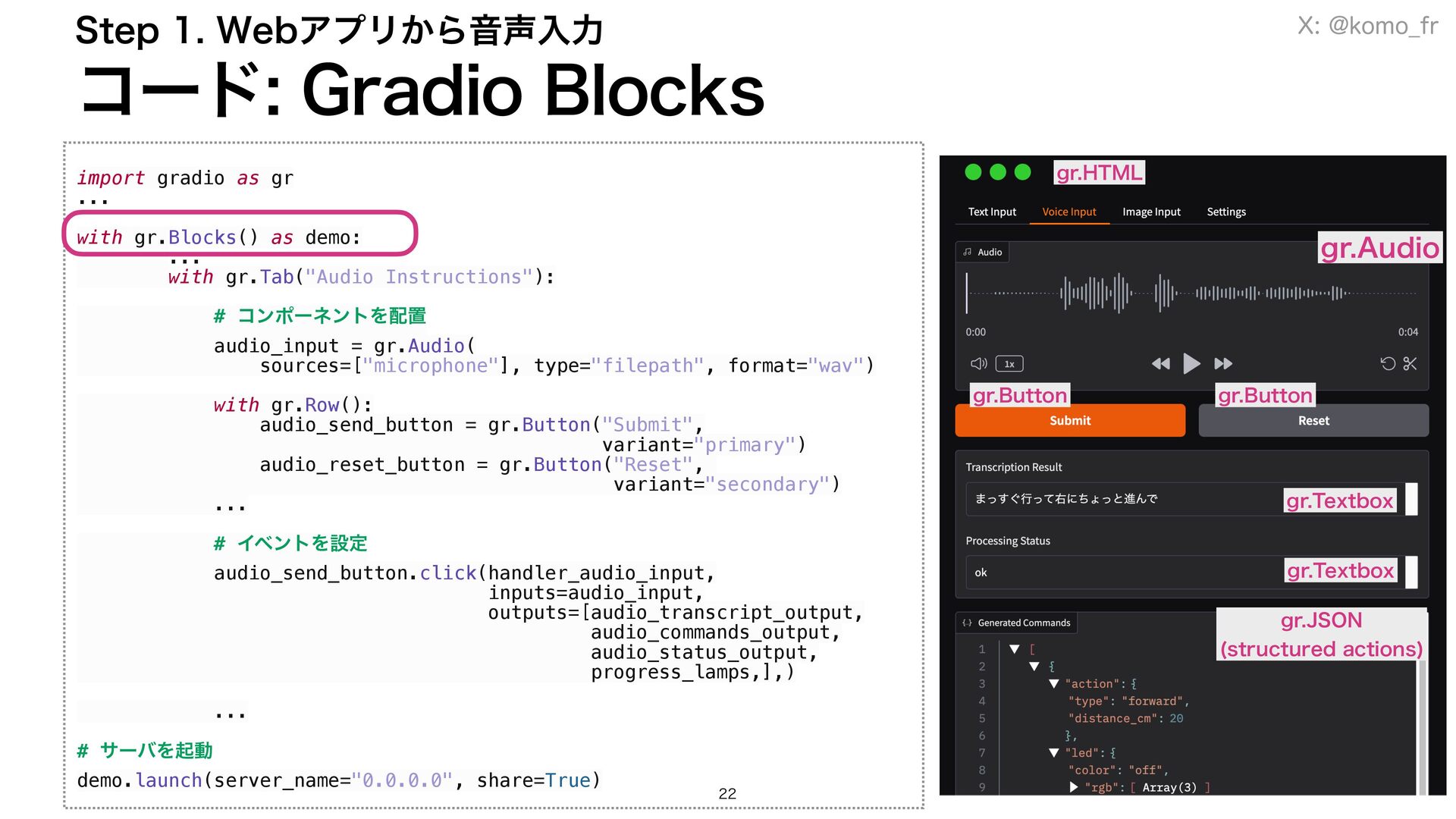 個人で気軽に試せる趣味プロジェクトの例として、生成AIを使った、音声や画像で操作できるRaspberry Pi Pico搭載の小さな車を紹介。実際のコードを交えて、仕組みや利用しているライブラリ(LangChain、Gradio、Microdot など)を説明しました。