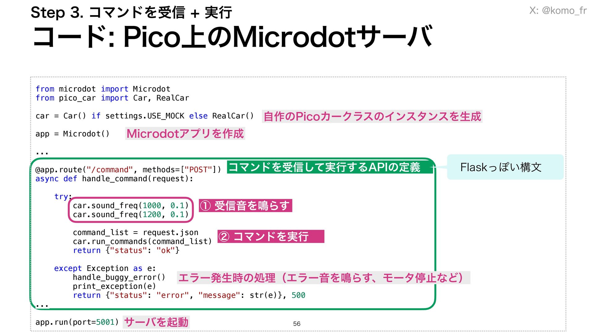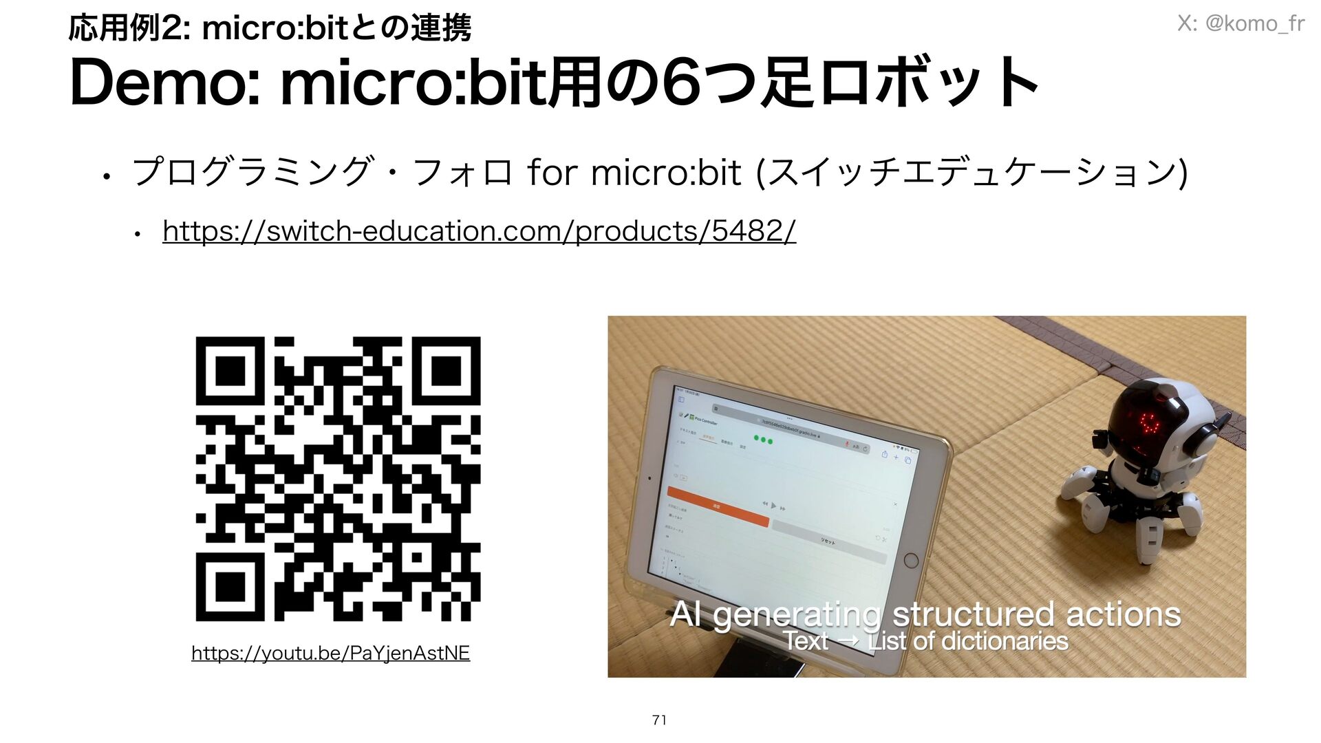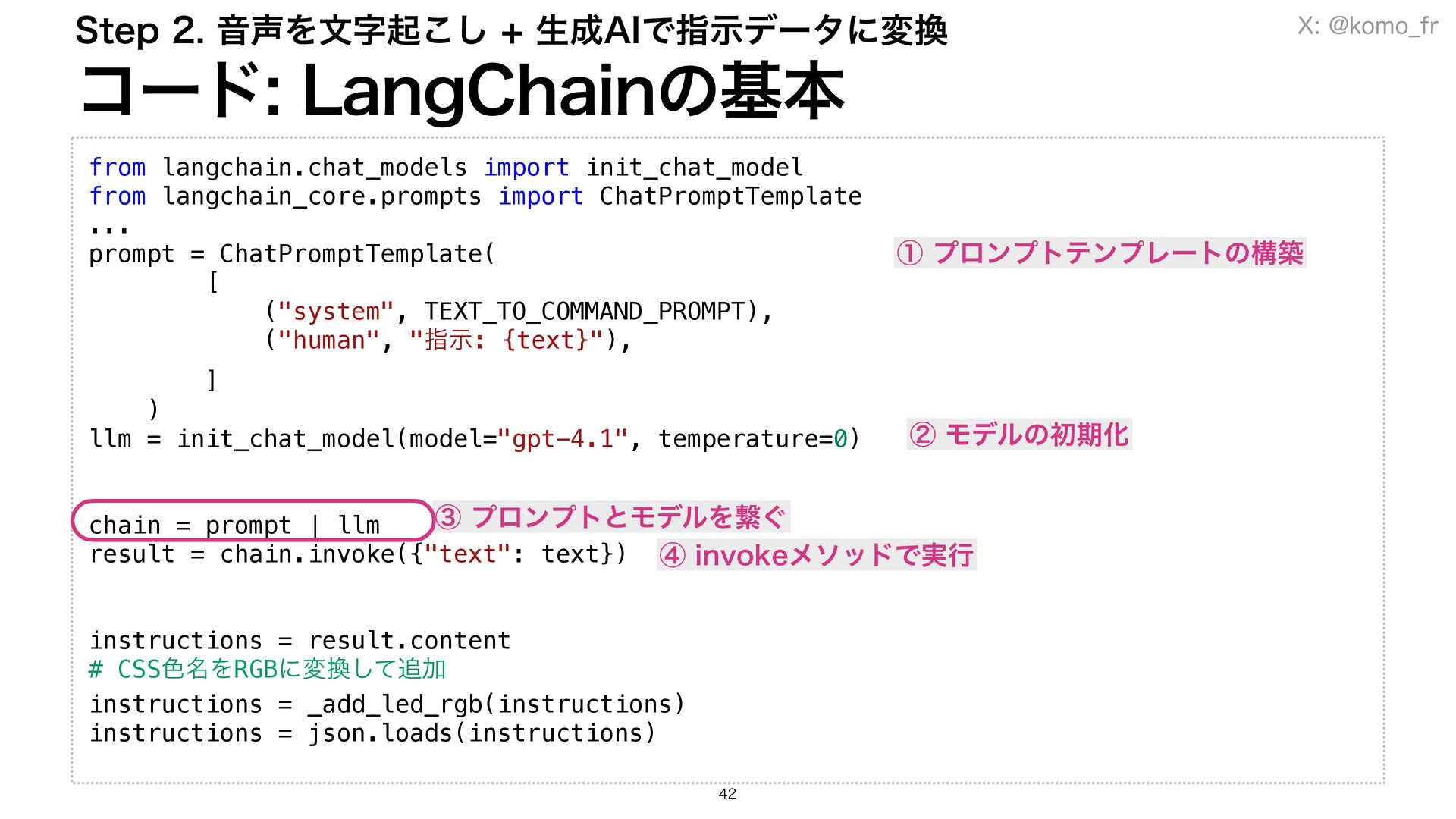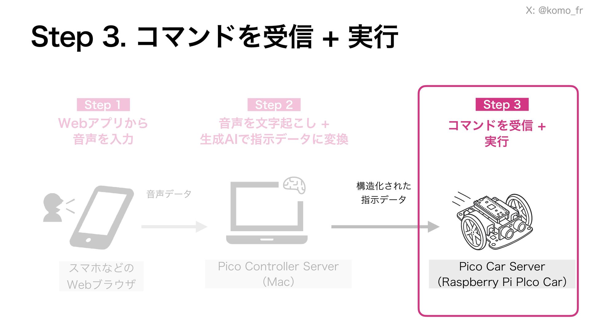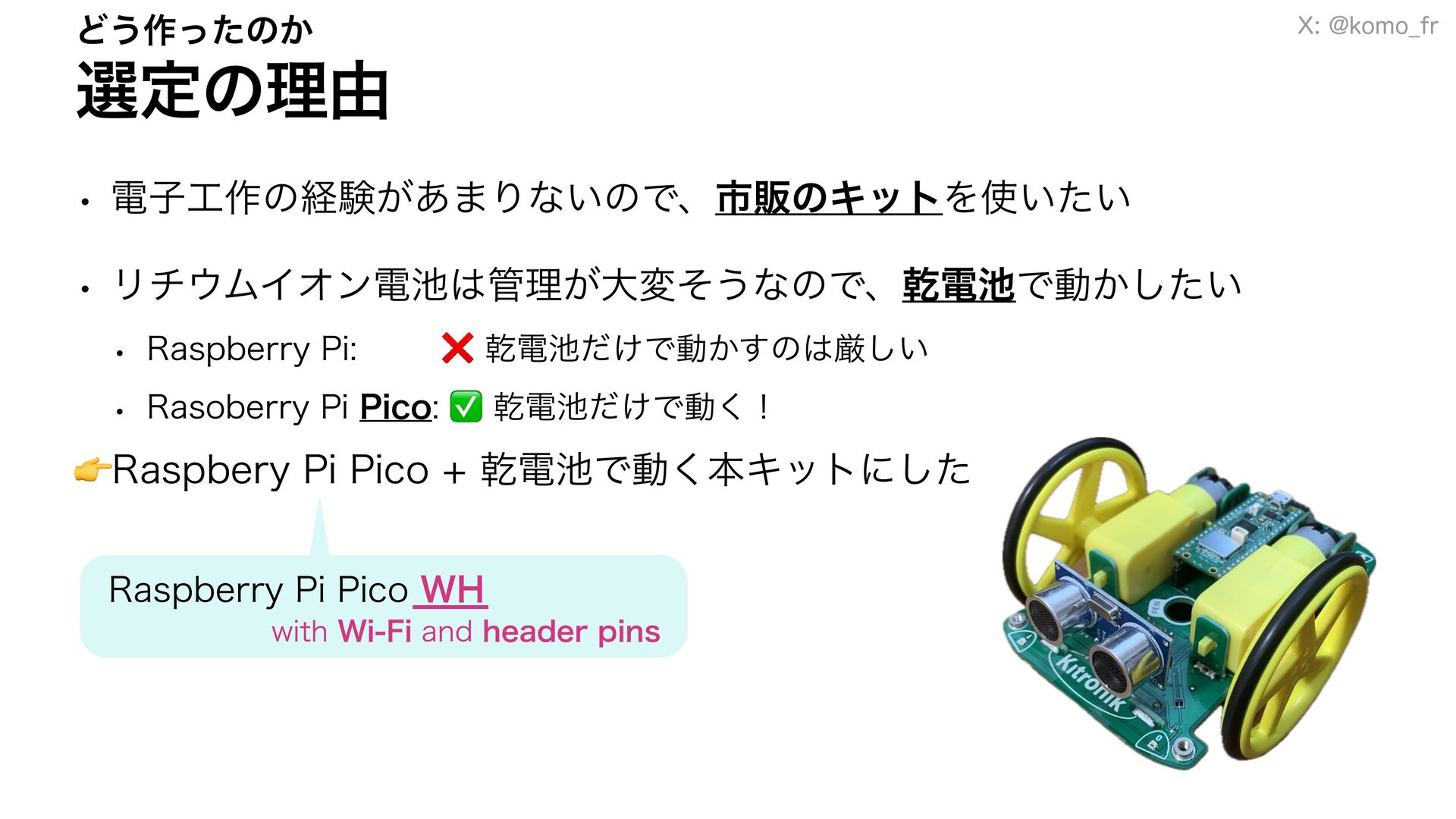 個人で気軽に試せる趣味プロジェクトの例として、生成AIを使った、音声や画像で操作できるRaspberry Pi Pico搭載の小さな車を紹介。実際のコードを交えて、仕組みや利用しているライブラリ(LangChain、Gradio、Microdot など)を説明しました。
