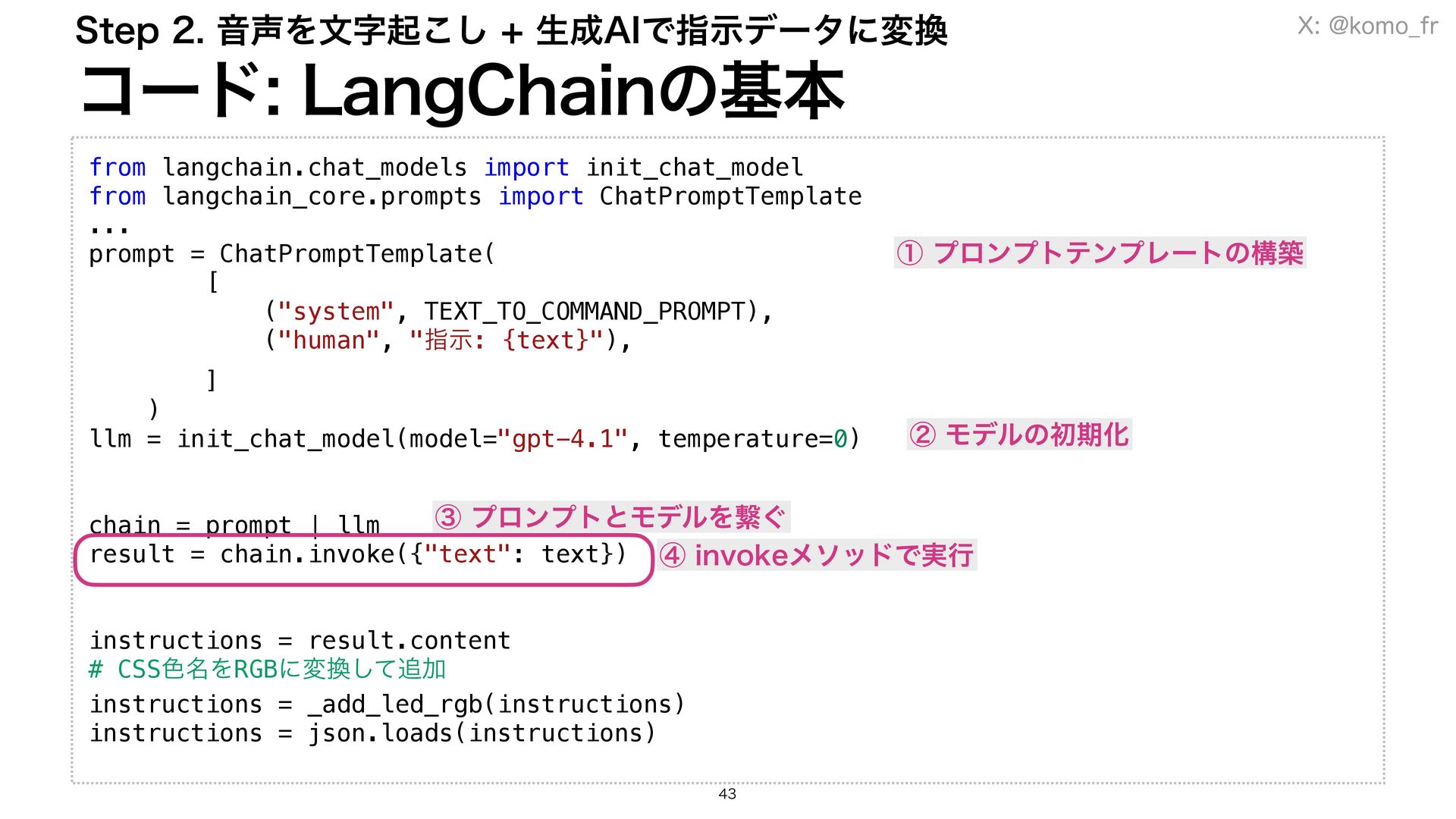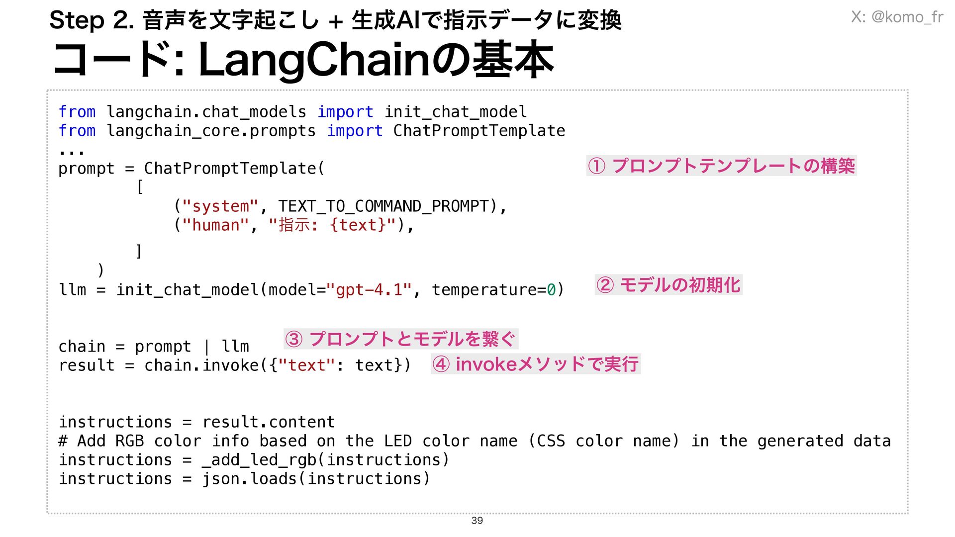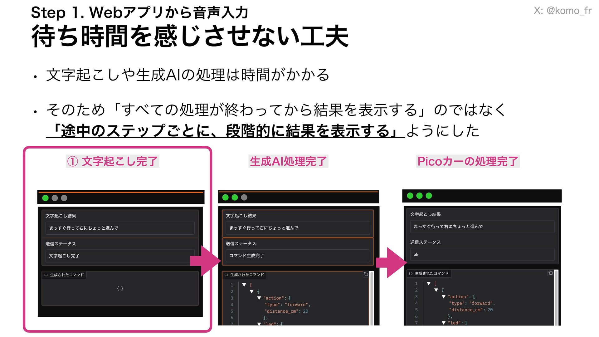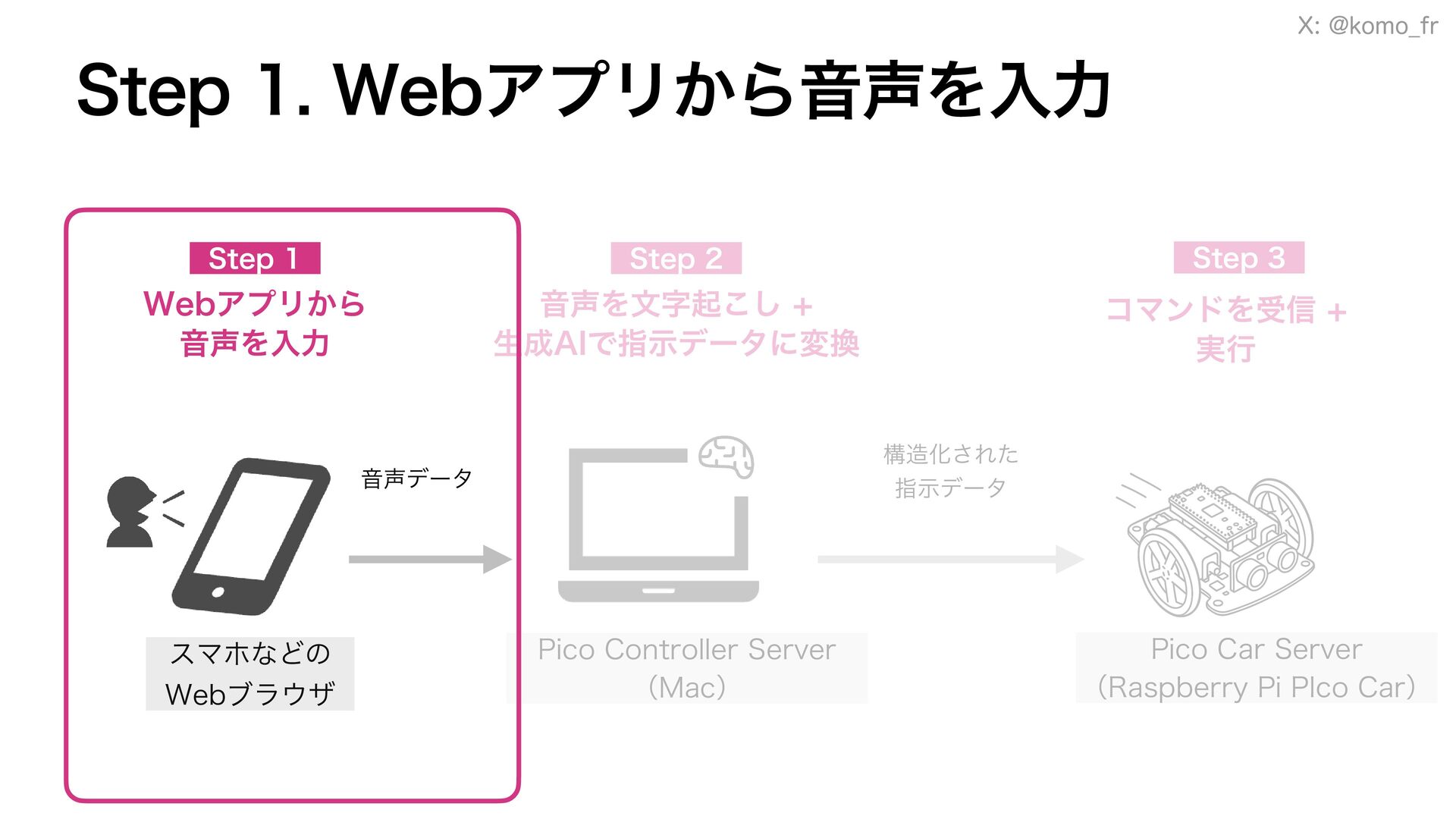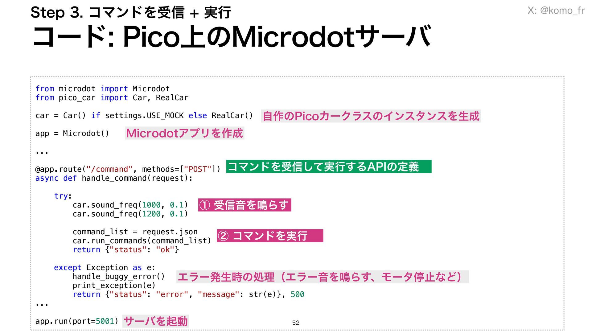 個人で気軽に試せる趣味プロジェクトの例として、生成AIを使った、音声や画像で操作できるRaspberry Pi Pico搭載の小さな車を紹介。実際のコードを交えて、仕組みや利用しているライブラリ(LangChain、Gradio、Microdot など)を説明しました。