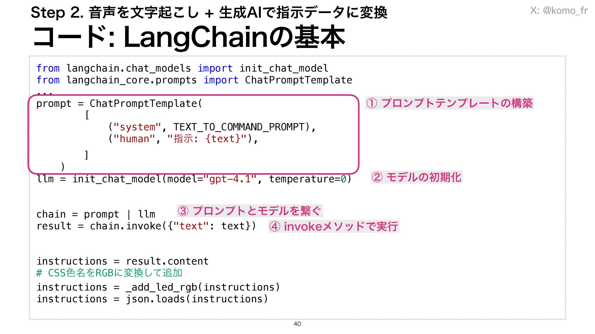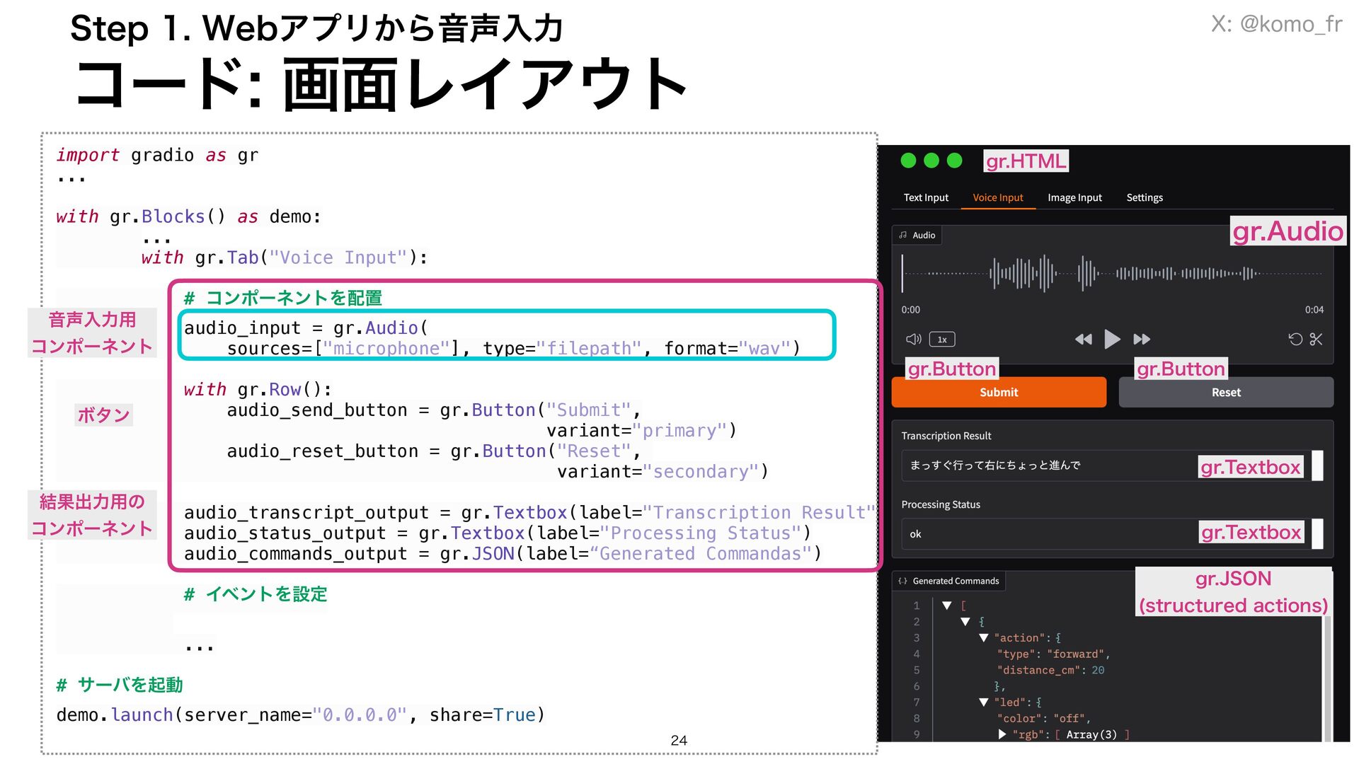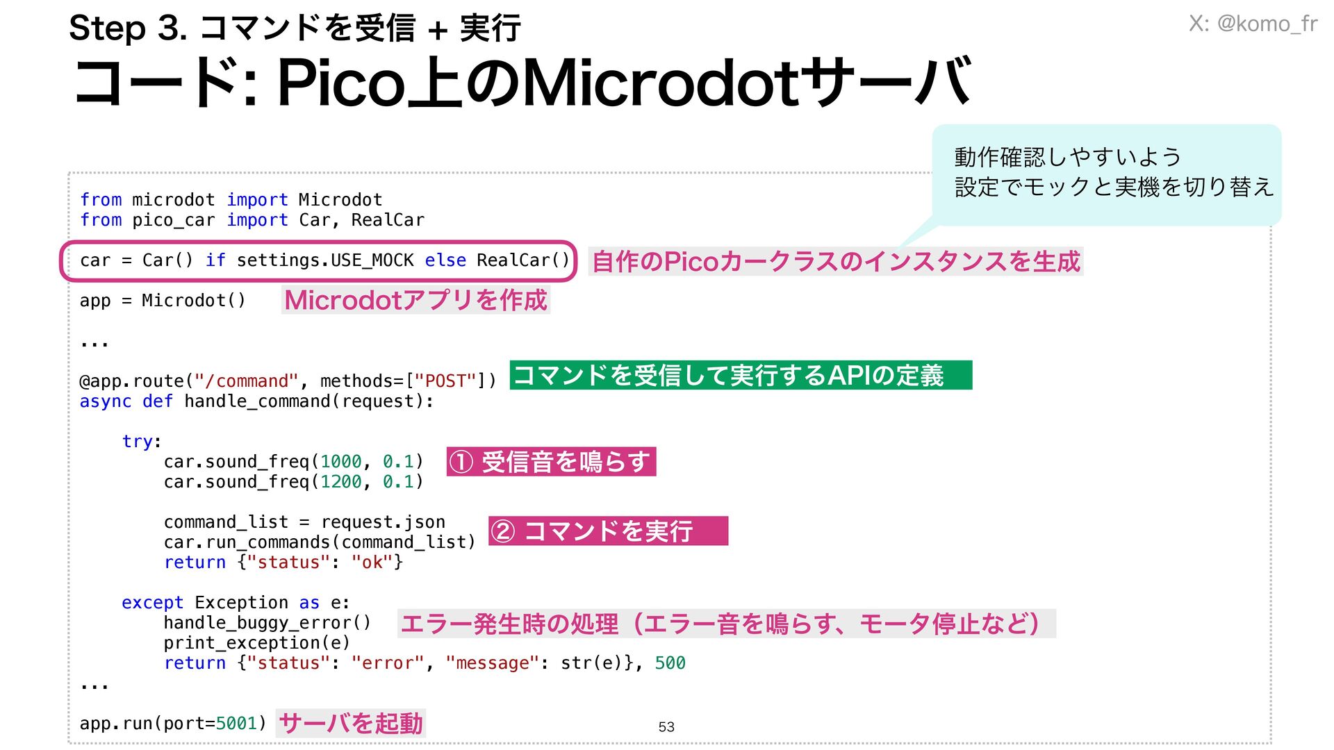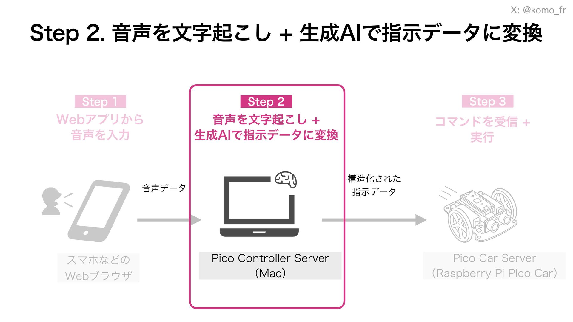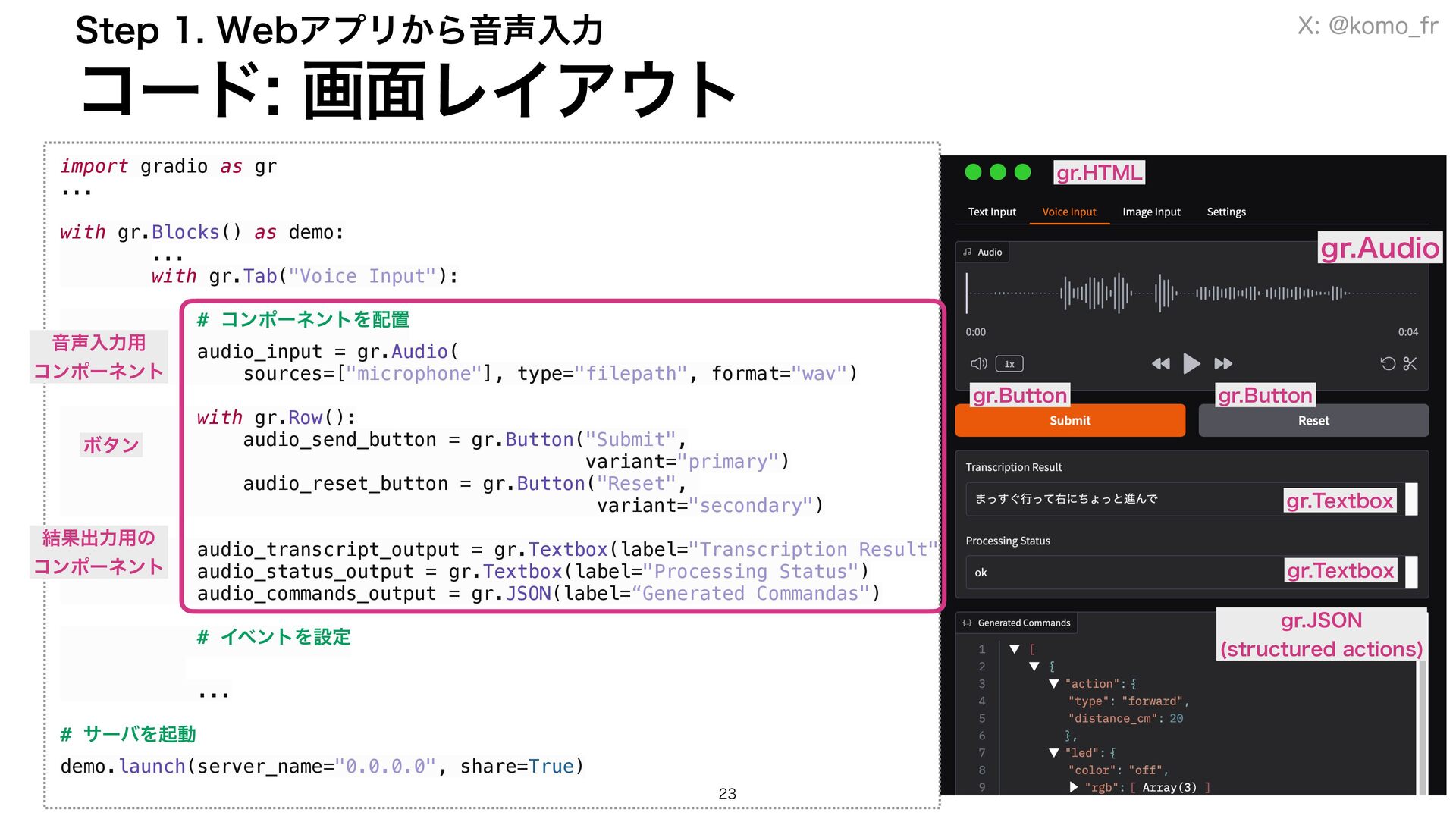 個人で気軽に試せる趣味プロジェクトの例として、生成AIを使った、音声や画像で操作できるRaspberry Pi Pico搭載の小さな車を紹介。実際のコードを交えて、仕組みや利用しているライブラリ(LangChain、Gradio、Microdot など)を説明しました。