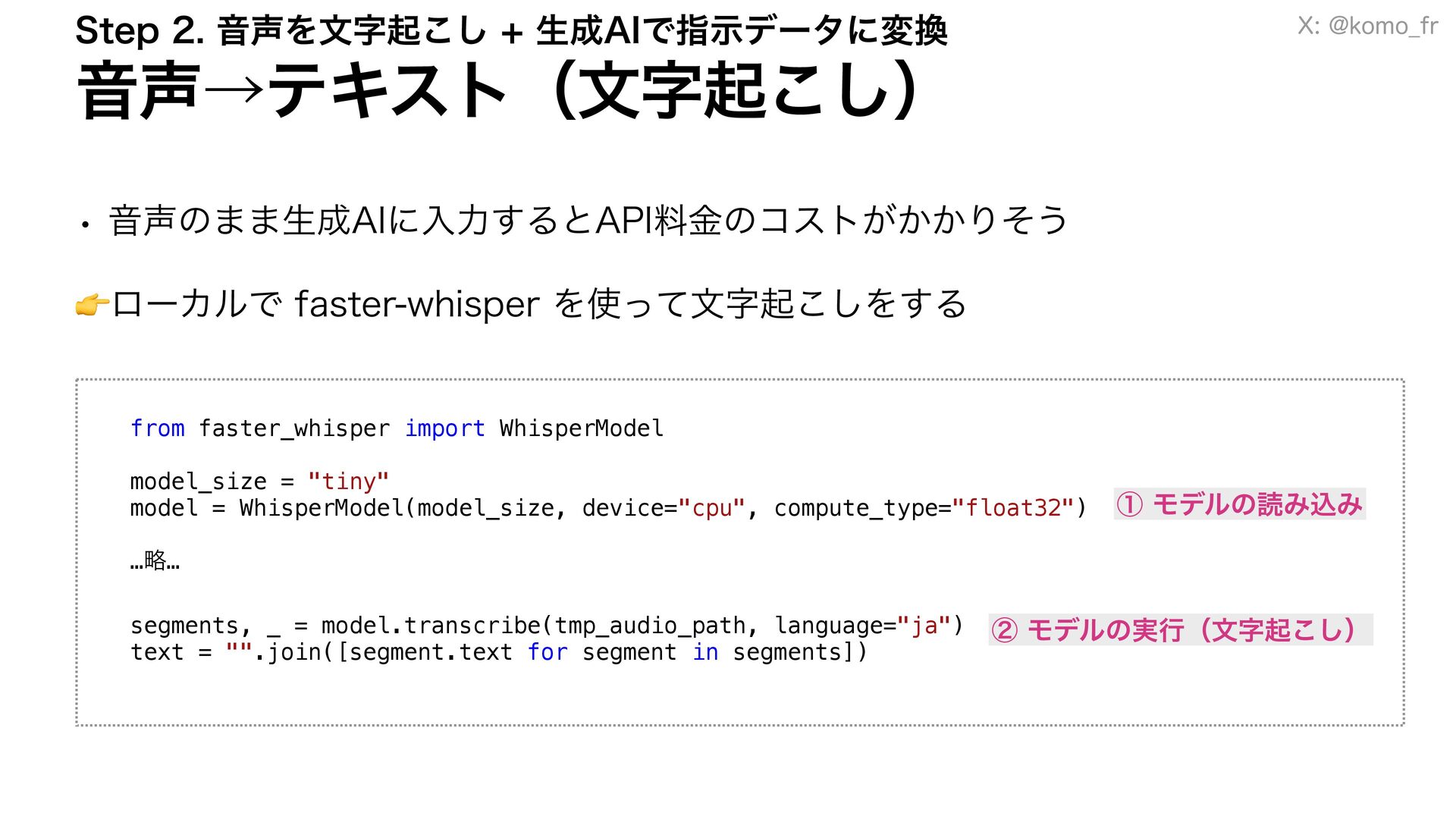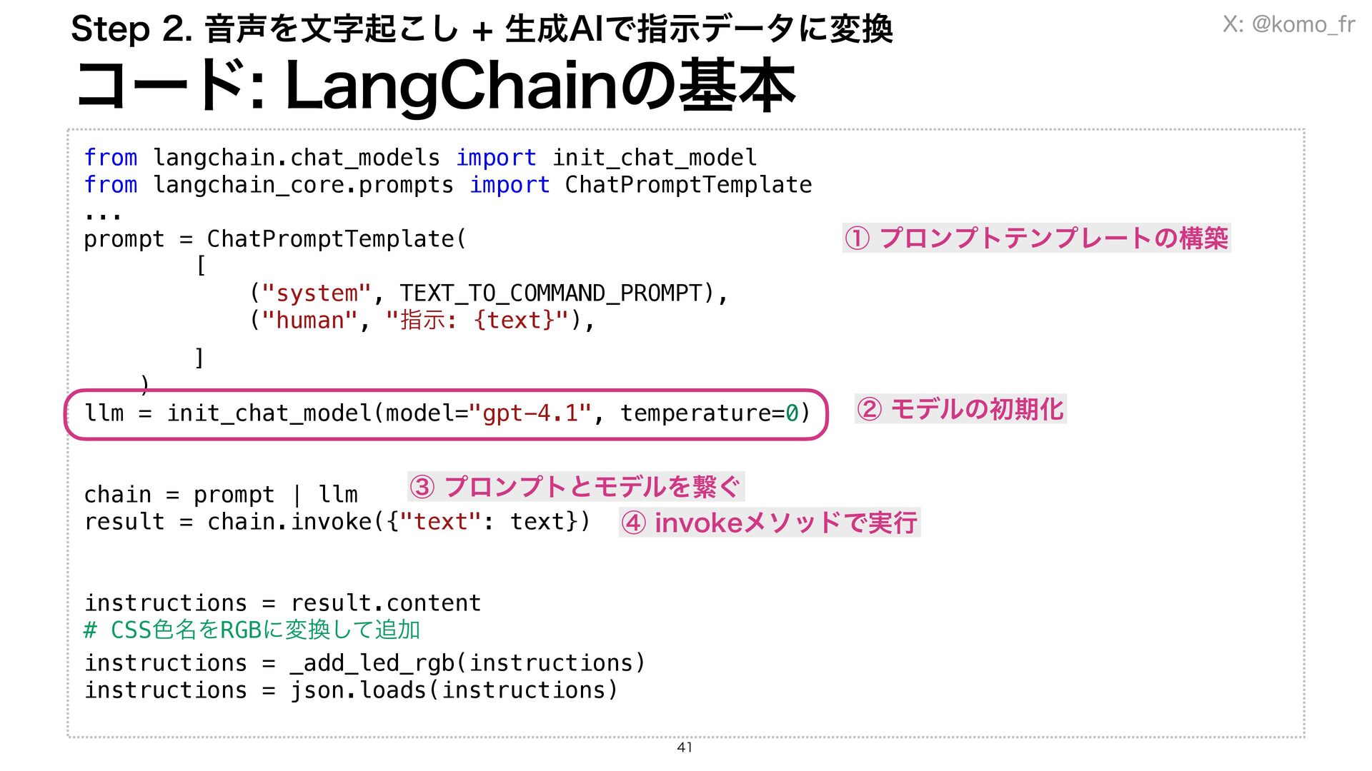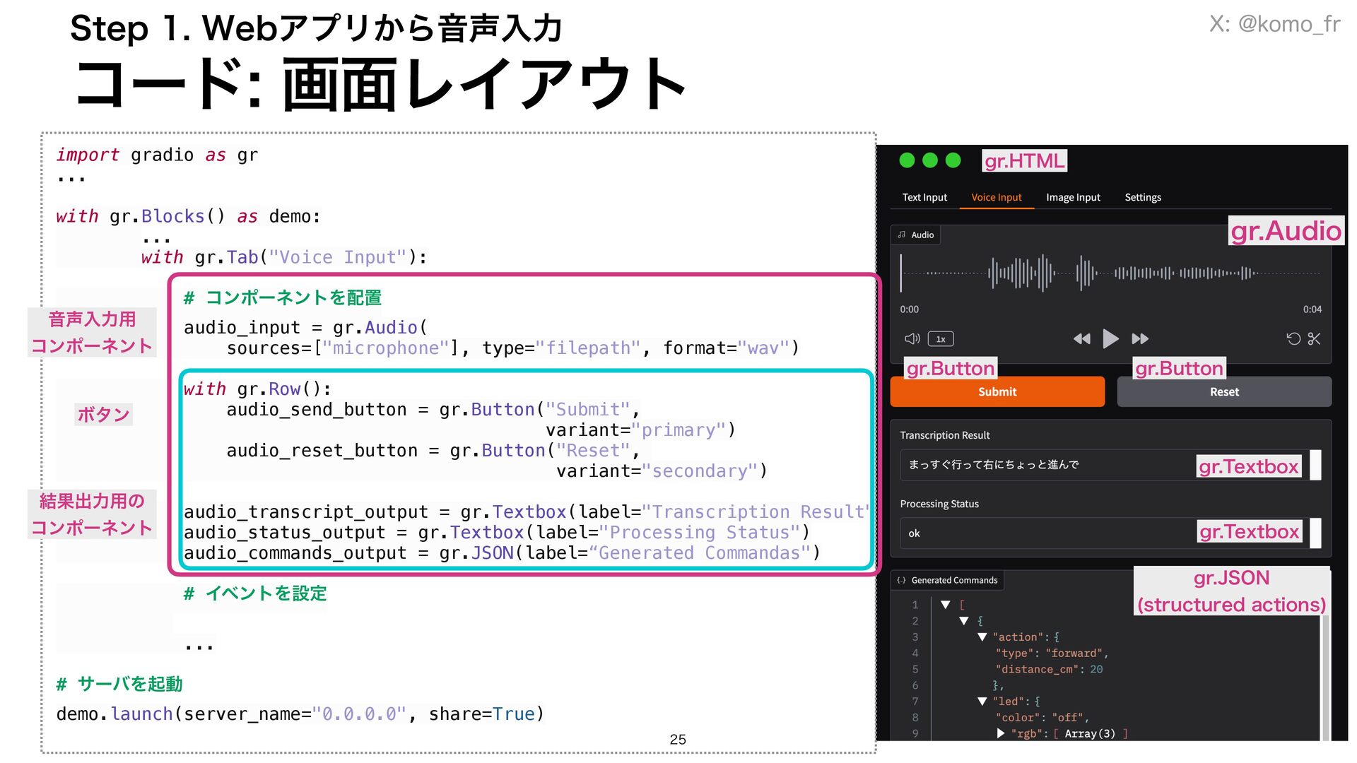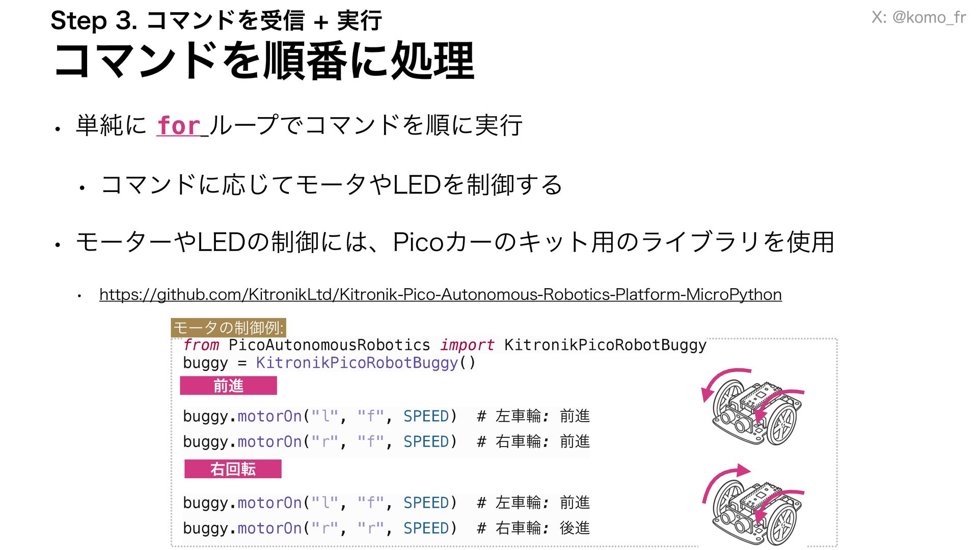個人で気軽に試せる趣味プロジェクトの例として、生成AIを使った、音声や画像で操作できるRaspberry Pi Pico搭載の小さな車を紹介。実際のコードを交えて、仕組みや利用しているライブラリ(LangChain、Gradio、Microdot など)を説明しました。