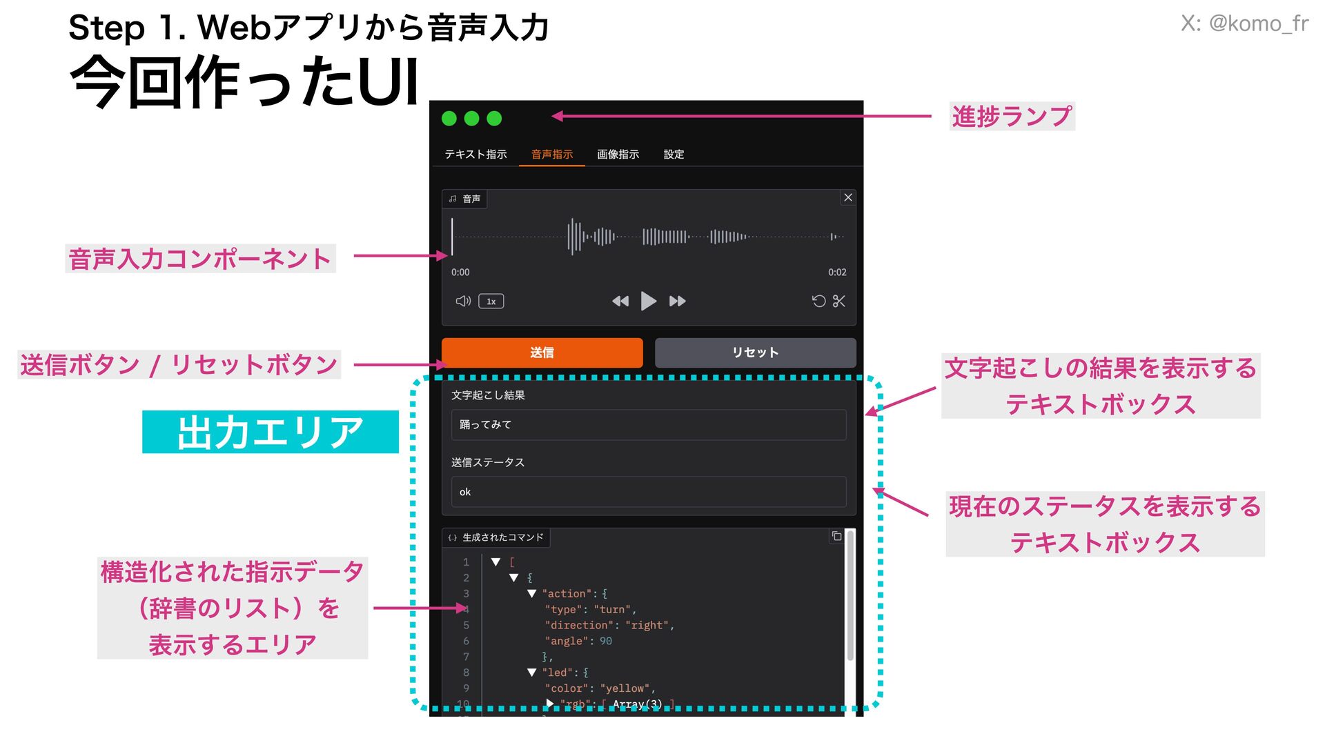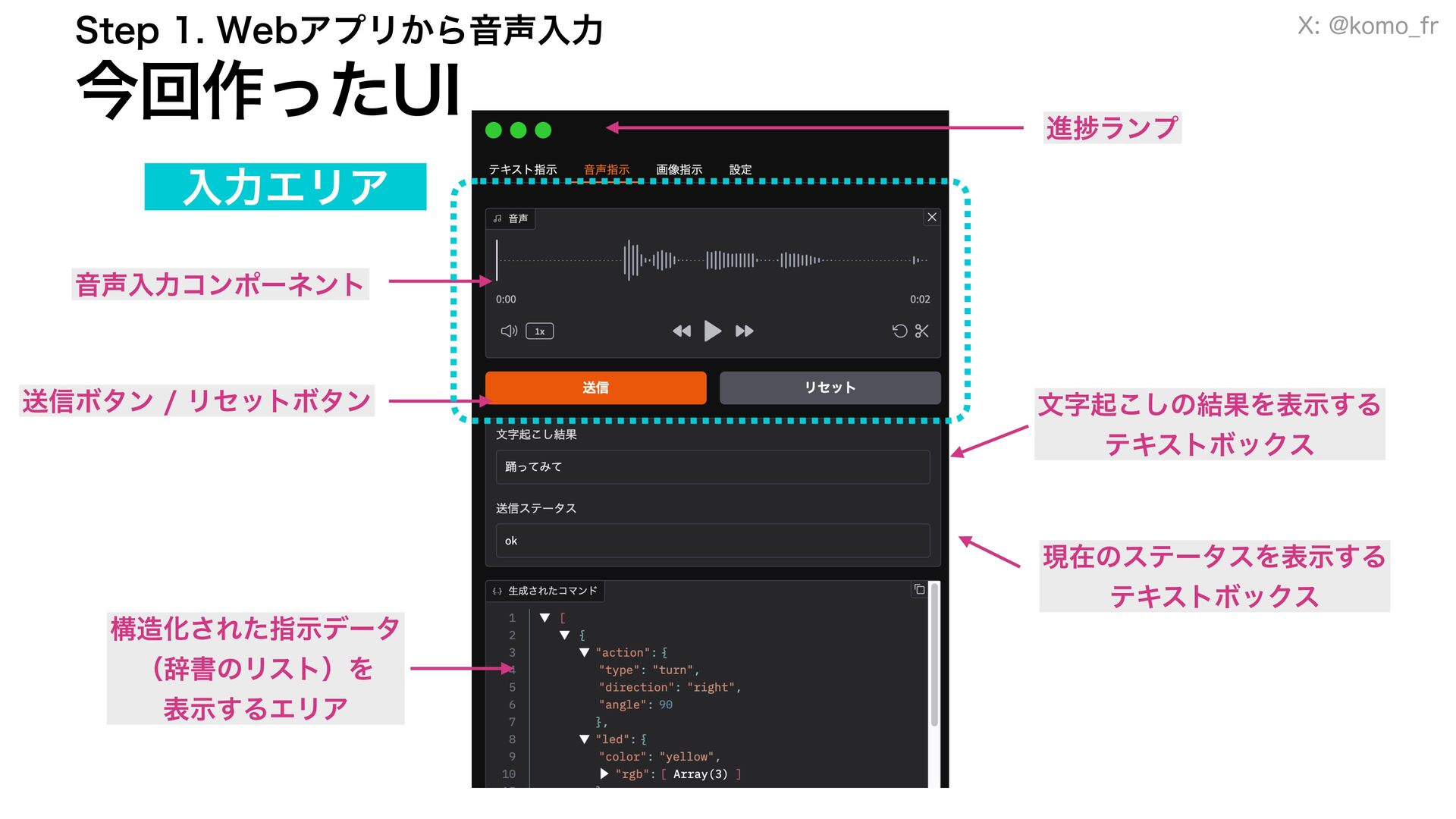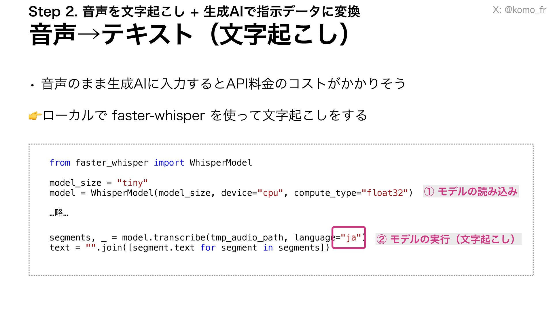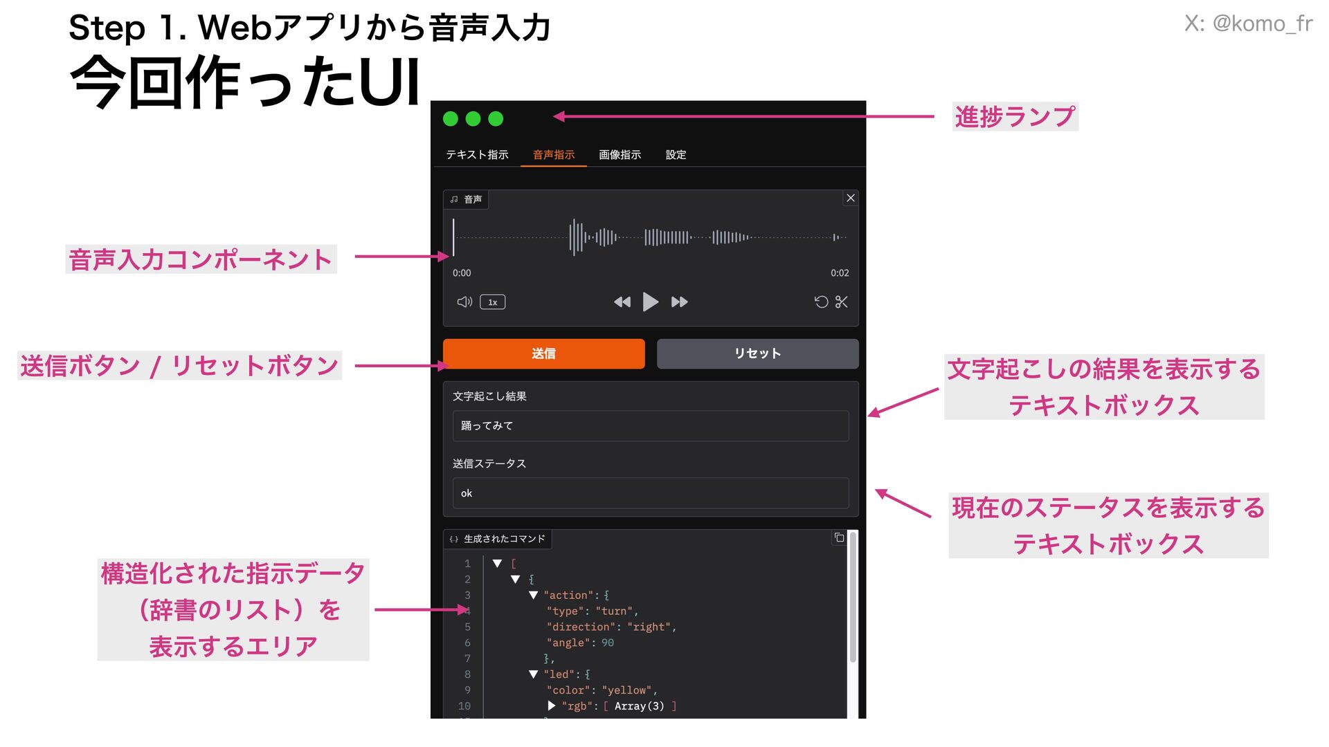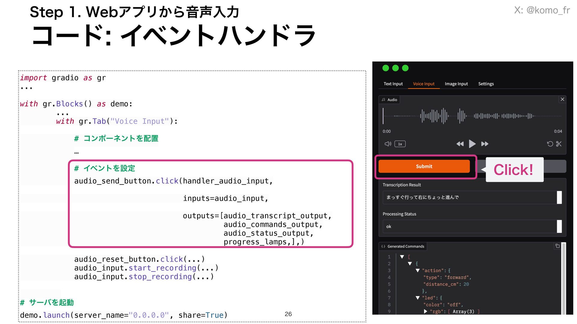 個人で気軽に試せる趣味プロジェクトの例として、生成AIを使った、音声や画像で操作できるRaspberry Pi Pico搭載の小さな車を紹介。実際のコードを交えて、仕組みや利用しているライブラリ(LangChain、Gradio、Microdot など)を説明しました。