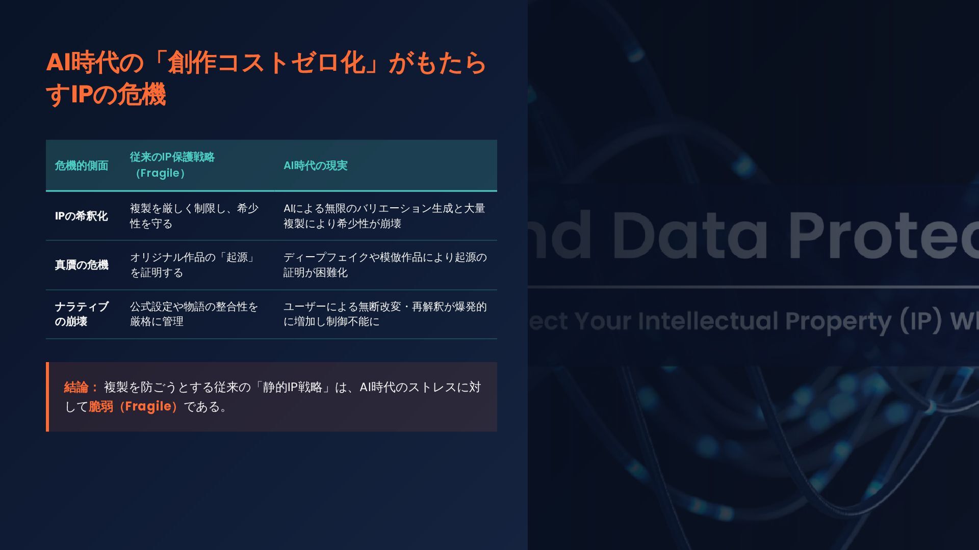 AI時代の「創作コストゼロ化」がもたら すIPの危機 危機的側面 従来のIP保護戦略 (Fragile) AI時代の現実 IPの希釈化 複製を厳しく制限し、希少 性を守る AIによる無限のバリエーション生成と大量
