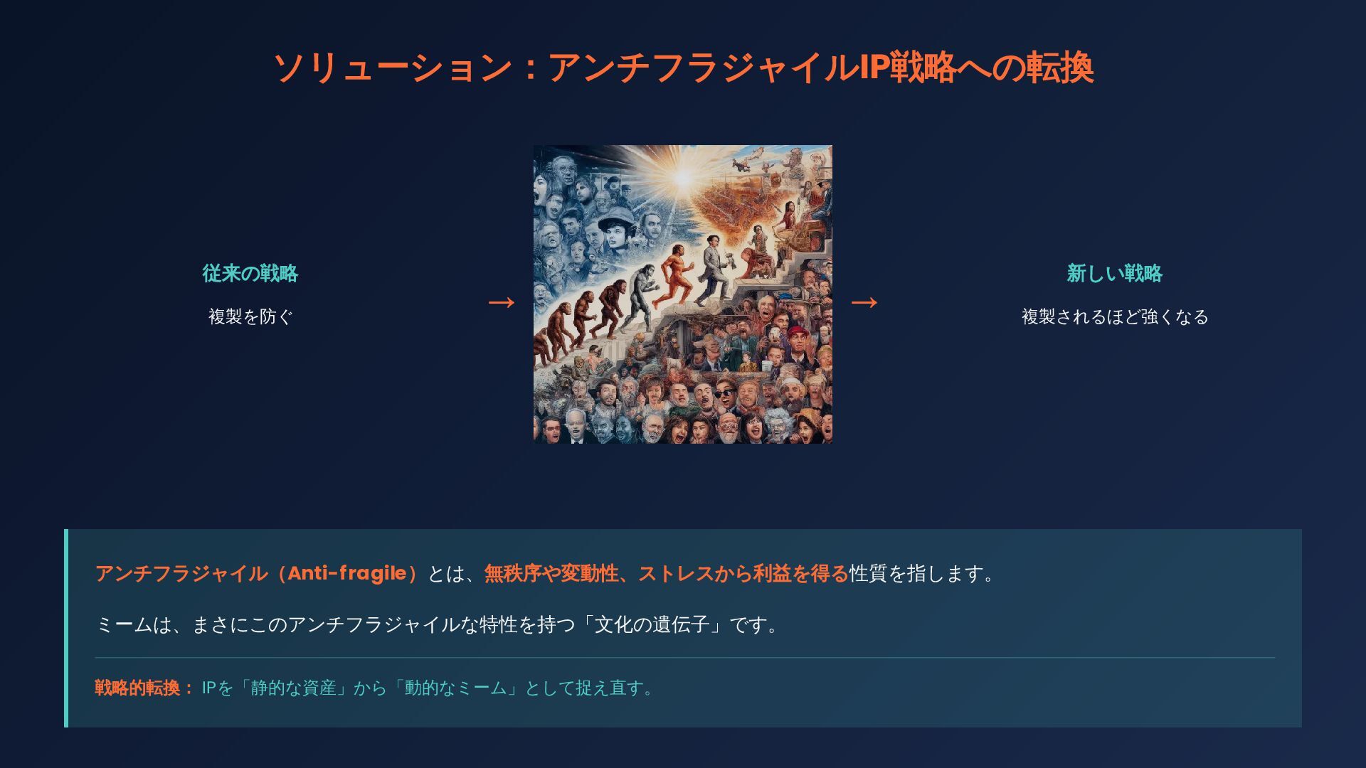 ソリューション:アンチフラジャイルIP戦略への転換 従来の戦略 複製を防ぐ 新しい戦略 複製されるほど強くなる アンチフラジャイル(Anti-fragile)とは、無秩序や変動性、ストレスから利益を得る性質を指します。 ミームは、まさにこのアンチフラジャイルな特性を持つ「文化の遺伝子」です。 戦略的転換: IPを「静的な資産」から「動的なミーム」として捉え直す。 →