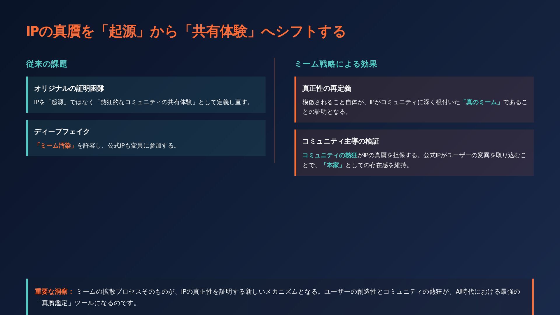 IPの真贋を「起源」から「共有体験」へシフトする 従来の課題 オリジナルの証明困難 IPを「起源」ではなく「熱狂的なコミュニティの共有体験」として定義し直す。 ディープフェイク 「ミーム汚染」を許容し、公式IPも変異に参加する。 ミーム戦略による効果 真正性の再定義 模倣されること自体が、IPがコミュニティに深く根付いた「真のミーム」であるこ との証明となる。