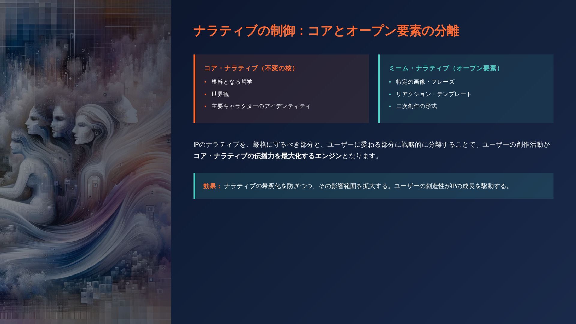 ナラティブの制御:コアとオープン要素の分離 コア・ナラティブ(不変の核) ミーム・ナラティブ(オープン要素) IPのナラティブを、厳格に守るべき部分と、ユーザーに委ねる部分に戦略的に分離することで、ユーザーの創作活動が コア・ナラティブの伝播力を最大化するエンジンとなります。 効果: ナラティブの希釈化を防ぎつつ、その影響範囲を拡大する。ユーザーの創造性がIPの成長を駆動する。 根幹となる哲学 ▪ 世界観