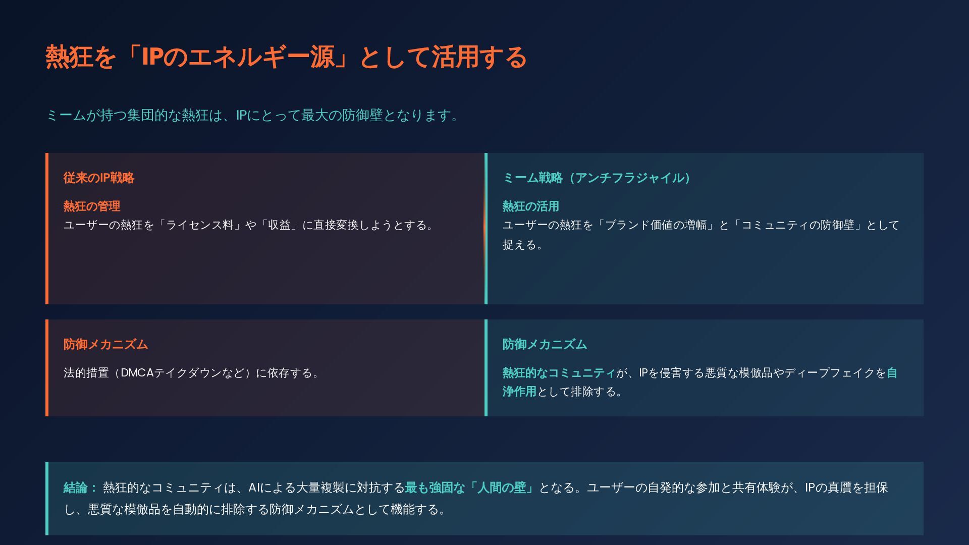 熱狂を「IPのエネルギー源」として活用する ミームが持つ集団的な熱狂は、IPにとって最大の防御壁となります。 従来のIP戦略 熱狂の管理 ユーザーの熱狂を「ライセンス料」や「収益」に直接変換しようとする。 ミーム戦略(アンチフラジャイル) 熱狂の活用 ユーザーの熱狂を「ブランド価値の増幅」と「コミュニティの防御壁」として 捉える。 防御メカニズム