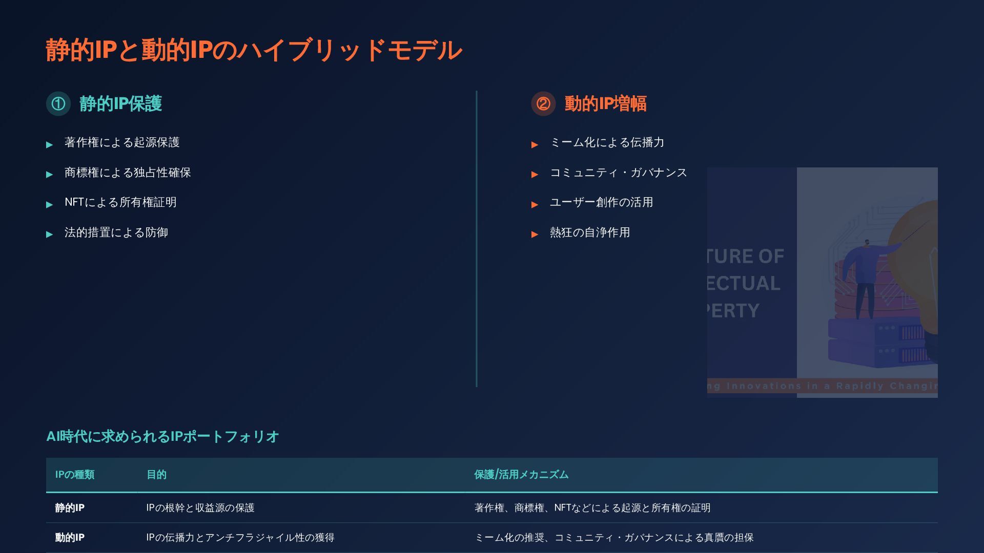 静的IPと動的IPのハイブリッドモデル AI時代に求められるIPポートフォリオ IPの種類 目的 保護/活用メカニズム 静的IP IPの根幹と収益源の保護 著作権、商標権、NFTなどによる起源と所有権の証明 動的IP IPの伝播力とアンチフラジャイル性の獲得