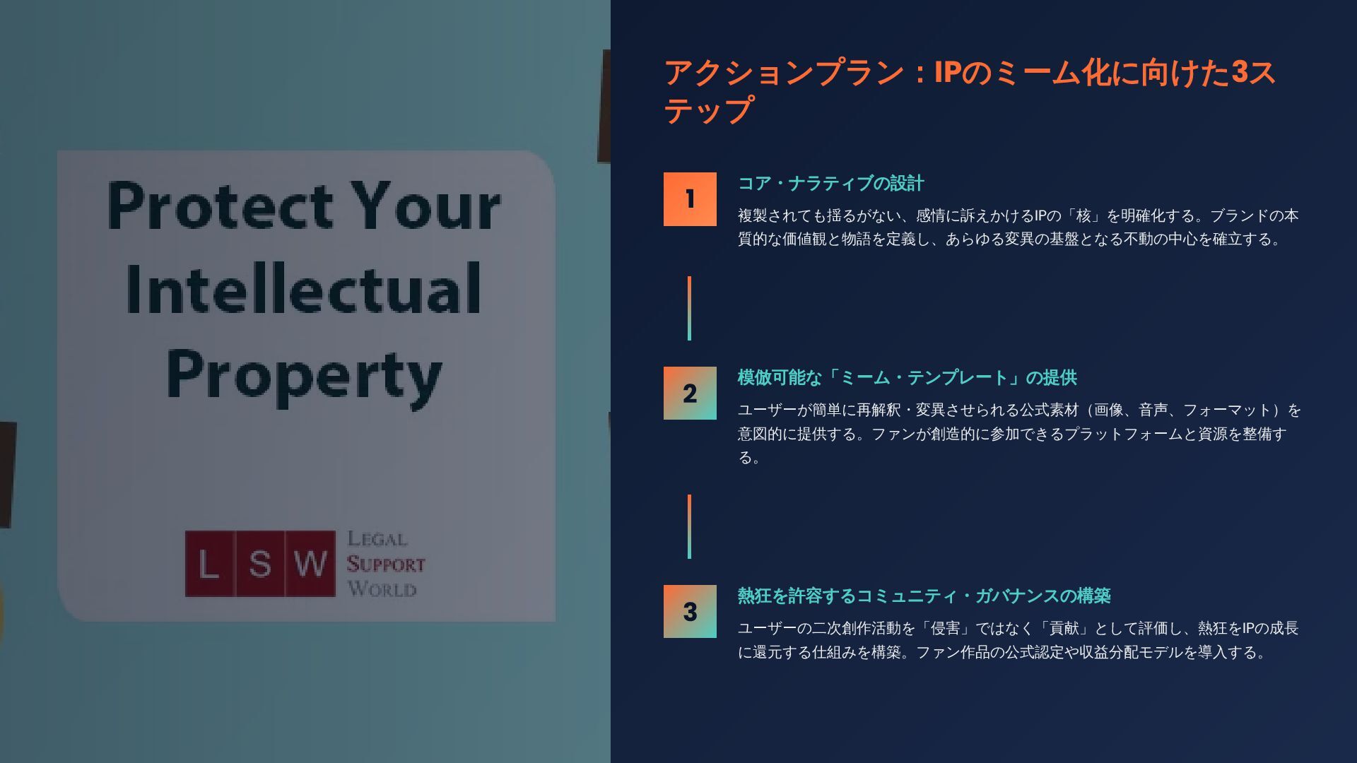 アクションプラン:IPのミーム化に向けた3ス テップ 1 コア・ナラティブの設計 2 模倣可能な「ミーム・テンプレート」の提供 3 熱狂を許容するコミュニティ・ガバナンスの構築 複製されても揺るがない、感情に訴えかけるIPの「核」を明確化する。ブランドの本 質的な価値観と物語を定義し、あらゆる変異の基盤となる不動の中心を確立する。