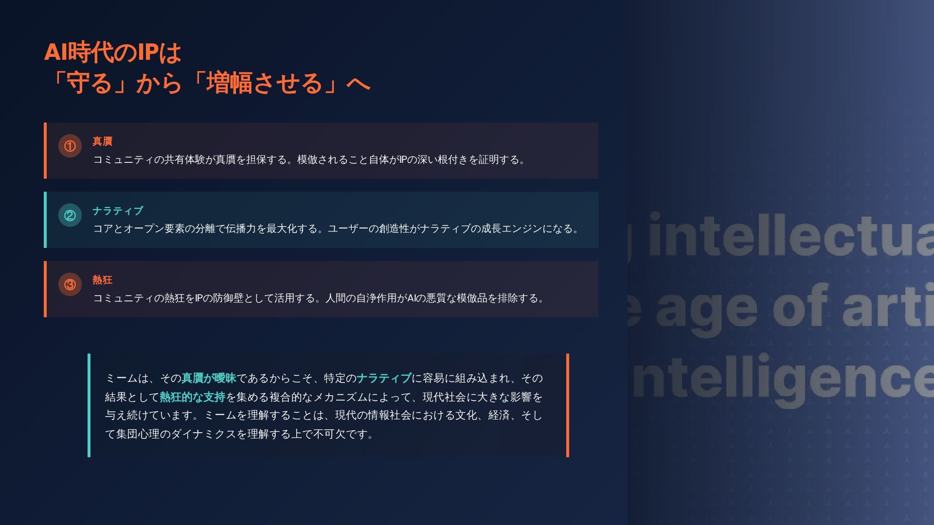 コミュニティの熱狂をIPの防御壁として活用する。人間の自浄作用がAIの悪質な模倣品を排除する。 ミームは、その真贋が曖昧であるからこそ、特定のナラティブに容易に組み込まれ、その 結果として熱狂的な支持を集める複合的なメカニズムによって、現代社会に大きな影響を 与え続けています。ミームを理解することは、現代の情報社会における文化、経済、そし て集団心理のダイナミクスを理解する上で不可欠です。
