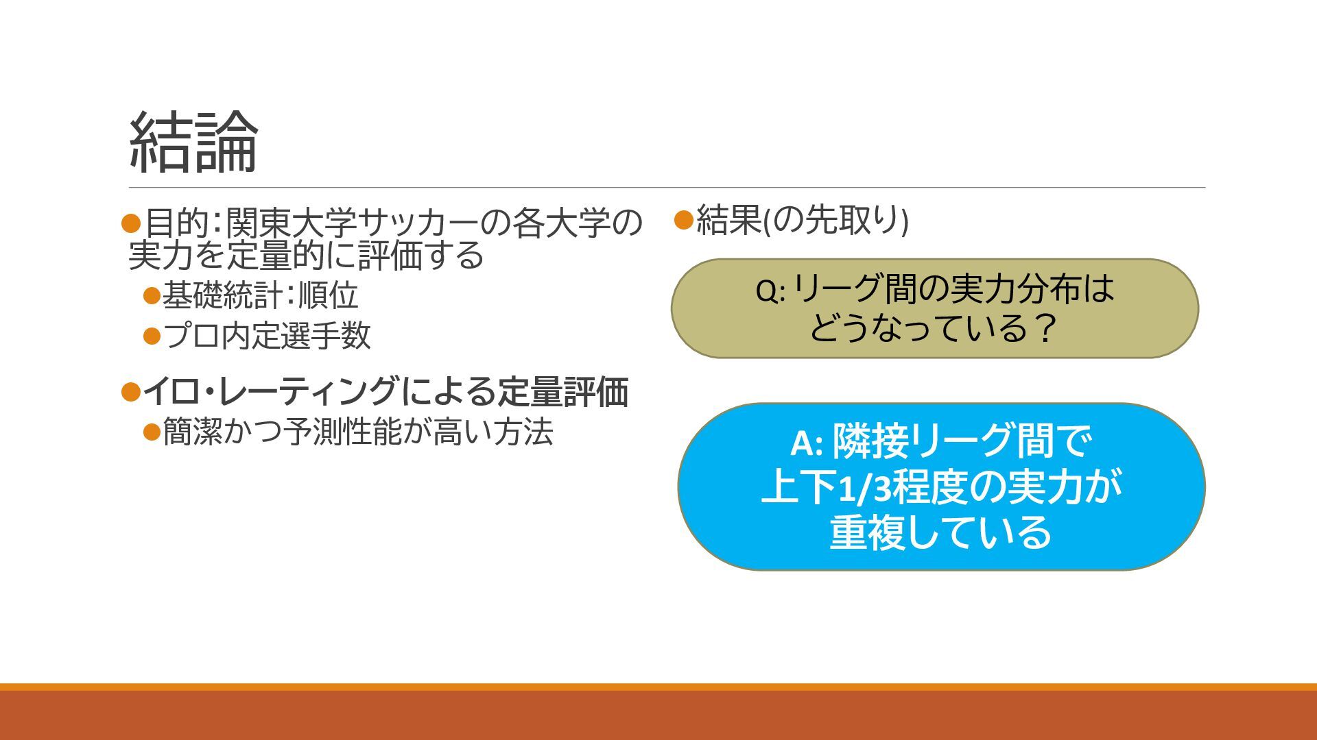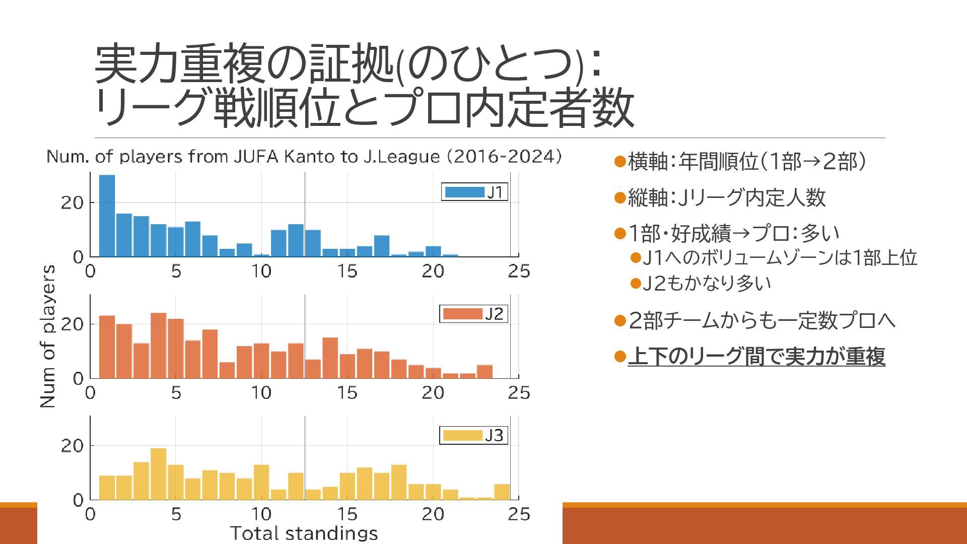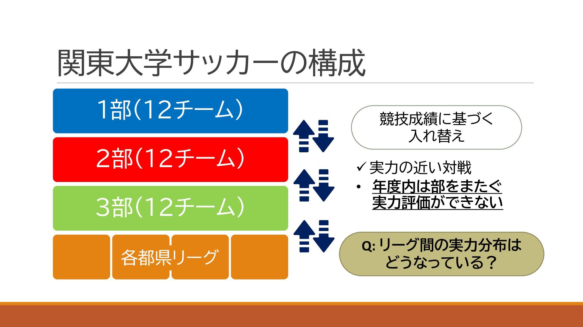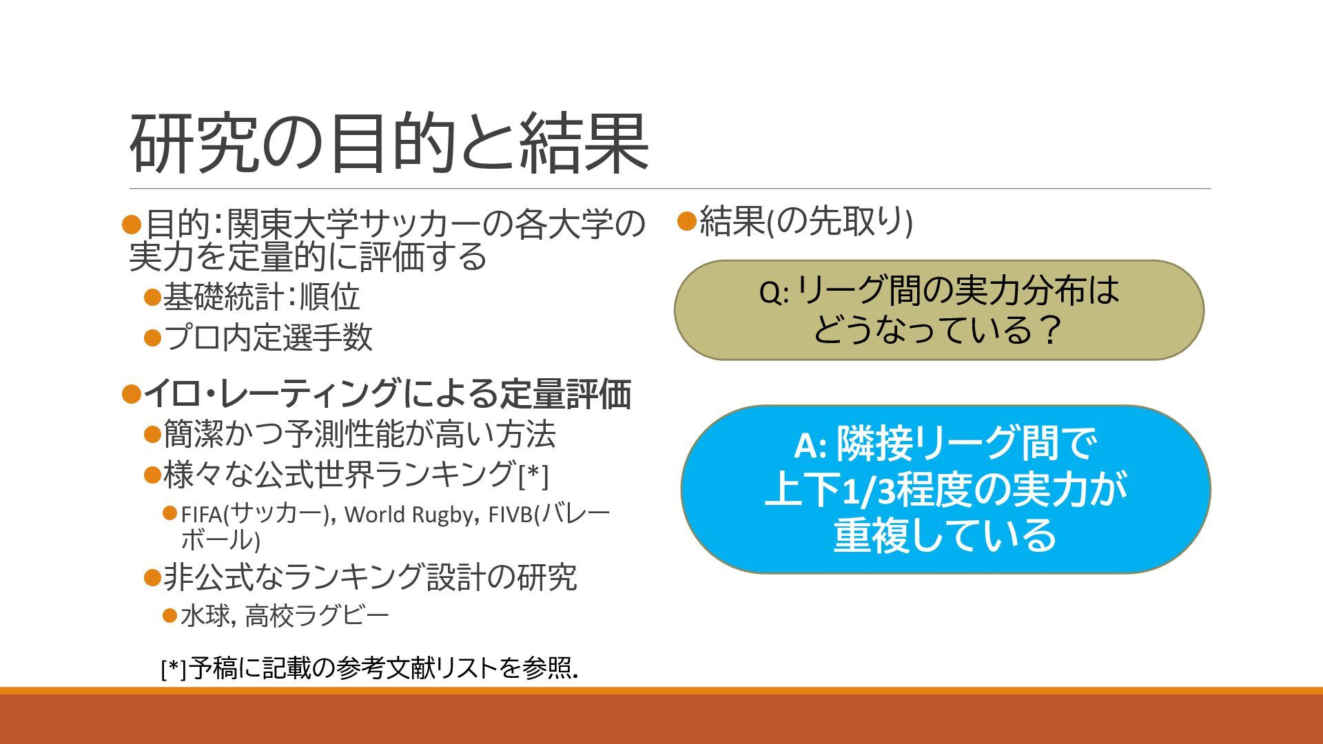 スポーツにおける代表的な定量的実力評価手法であるイロレーティングを利用し,関東大学サッカーの実力分布を定量化しました.大学の競技成績とプロ内定者数についても併せて評価し,上下に分割されている1部,2部,および3部の実力分布が重複していることを確認しました.