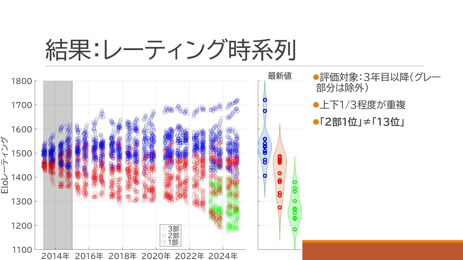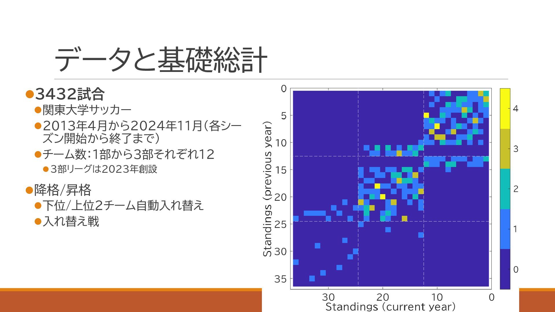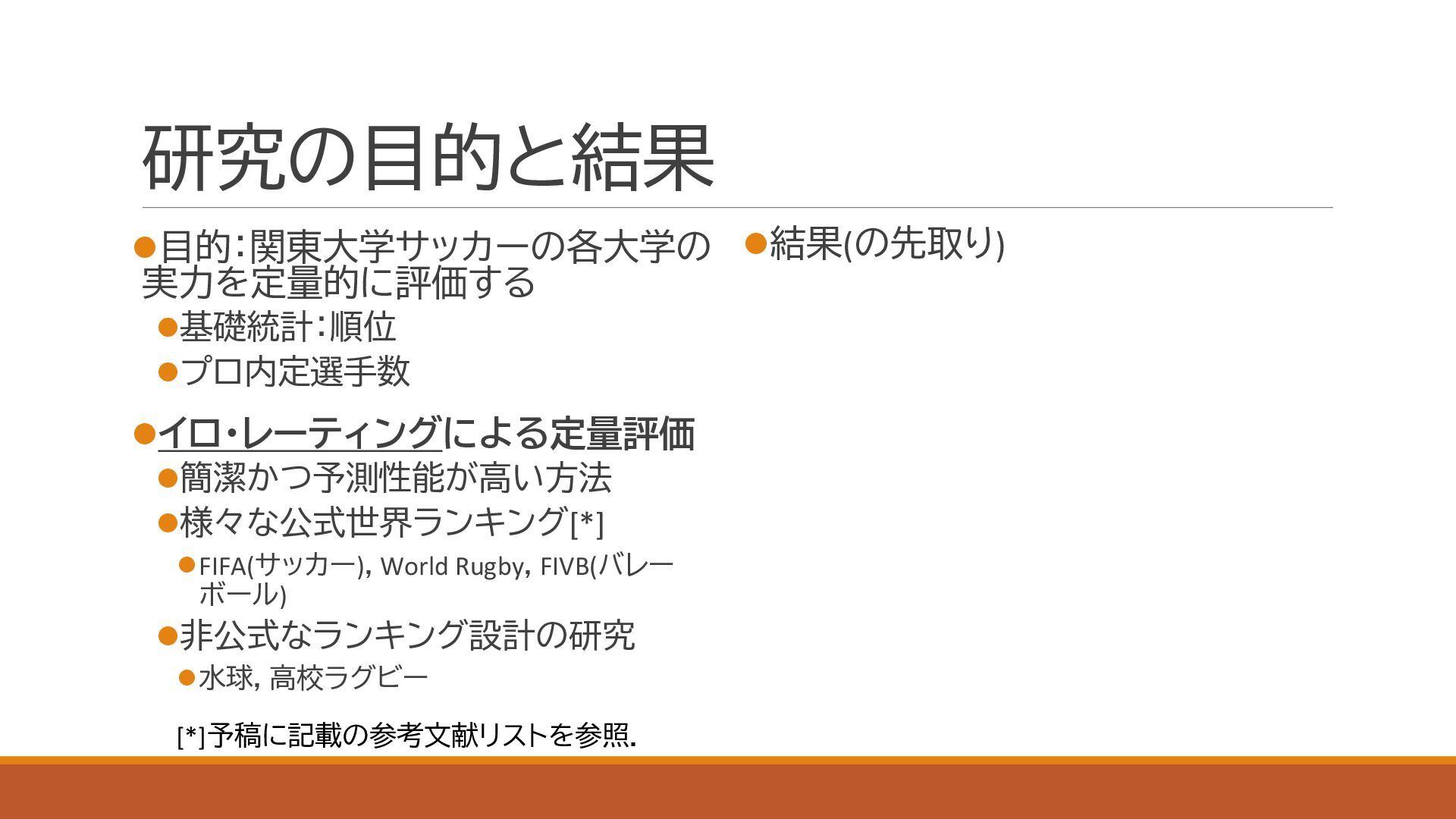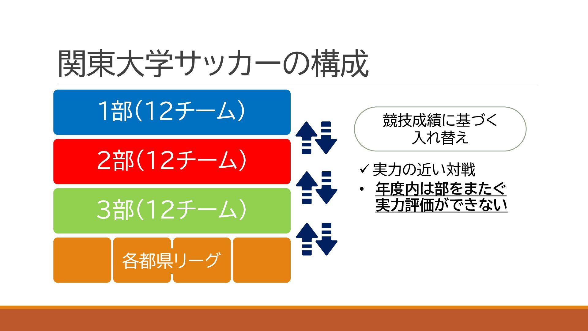スポーツにおける代表的な定量的実力評価手法であるイロレーティングを利用し,関東大学サッカーの実力分布を定量化しました.大学の競技成績とプロ内定者数についても併せて評価し,上下に分割されている1部,2部,および3部の実力分布が重複していることを確認しました.