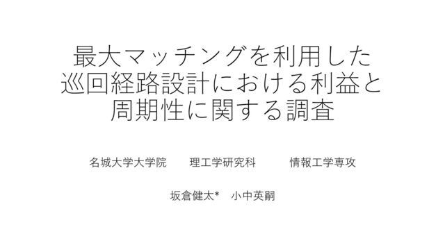 警備ロボットの経路計画問題について,最大マッチングに着目することで直前に選んだ経路と異なる経路を設計できる手法を提案しました.警備経路に利益を定義したとき,経路計画手法ごとにどのような特徴があるのかを特定の数値例に対して検証しています.