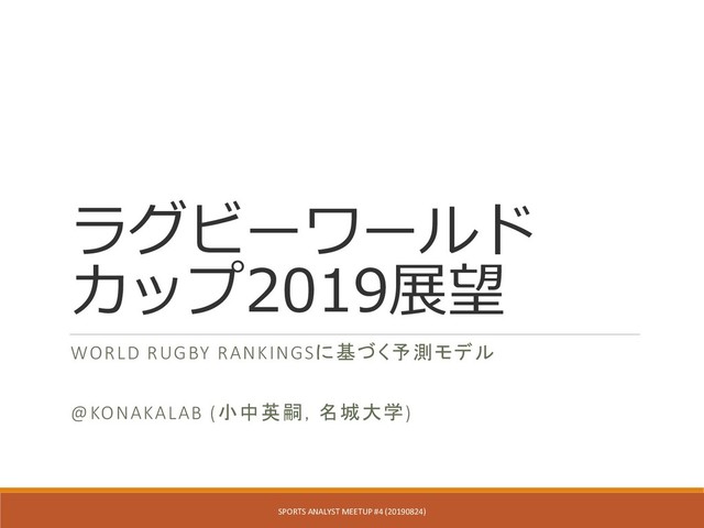 ラグビー代表チームの実力評価指標として公式のWorld Rugby Rankingsが非常に優秀であることを,過去のワールドカップ4大会の結果から示します.また,ランキングポイント差と得失点差の関係から予測モデルを構築し,2019年大会の予測と展望をお話します.