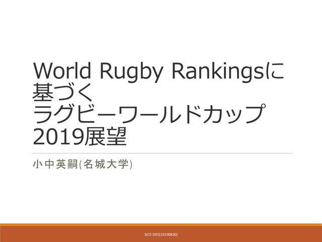 after a Rugby match with special reference to tackle plays. Takarada Y. Br J Sports Med. 37. 416-419. 2003. 右表:シーズン中の例(毎週試合 がある) Source: https://rugbyready.worldrugby.org/ ?section=61_3 SICE-DES(20190830) Day Activity 0 Match 1 Recovery 2 Strength and conditioning training, or recovery option 3 High-intensity Rugby training 4 Strength and conditioning training 5 Medium to low-intensity Rugby training 6 Rest 7 Match