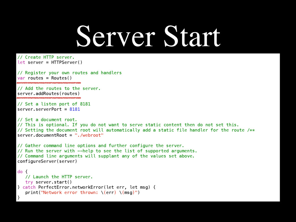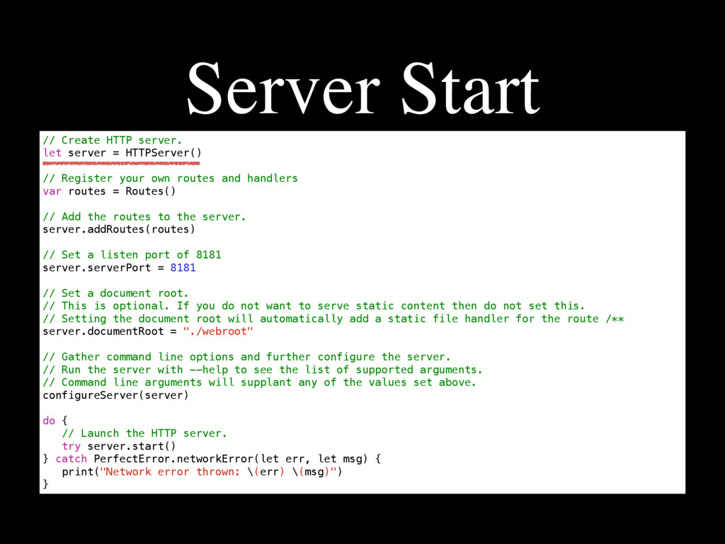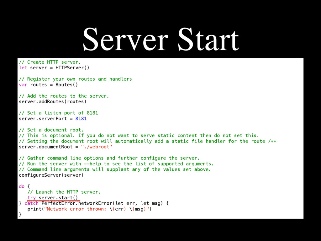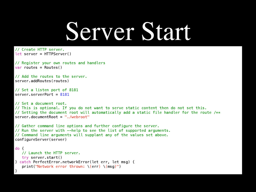 your own routes and handlers var routes = Routes() // Add the routes to the server. server.addRoutes(routes) // Set a listen port of 8181 server.serverPort = 8181 // Set a document root. // This is optional. If you do not want to serve static content then do not set this. // Setting the document root will automatically add a static file handler for the route /** server.documentRoot = "./webroot" // Gather command line options and further configure the server. // Run the server with --help to see the list of supported arguments. // Command line arguments will supplant any of the values set above. configureServer(server) do { // Launch the HTTP server. try server.start() } catch PerfectError.networkError(let err, let msg) { print("Network error thrown: \(err) \(msg)") } Server Start