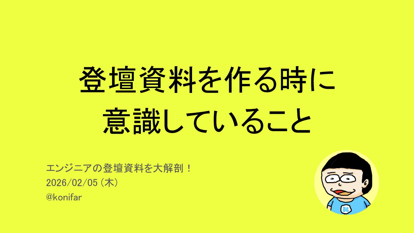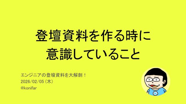 登壇資料を作る時に 意識していること エンジニアの登壇資料を大解剖! 2026/02/05 (木) @konifar