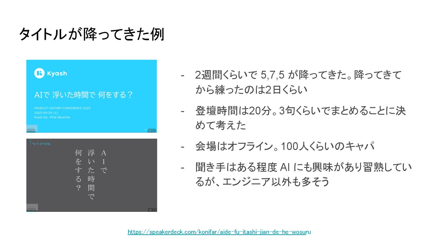 - 会場はオフライン。100人くらいのキャパ - 聞き手はある程度 AI にも興味があり習熟してい るが、エンジニア以外も多そう タイトルが降ってきた例