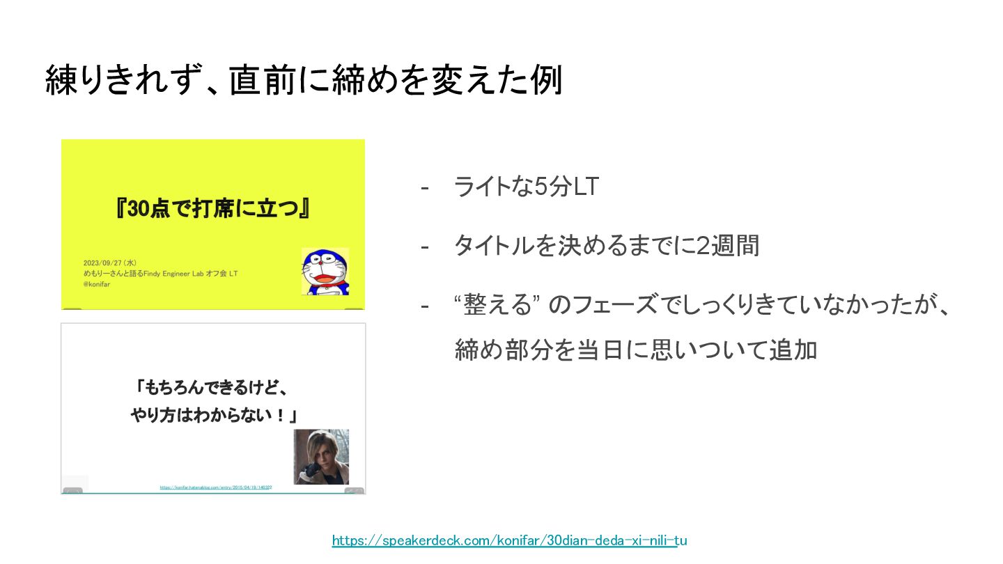 https://speakerdeck.com/konifar/30dian-deda-xi-nili-tu - ライトな5分LT - タイトルを決めるまでに2週間 - “整える” のフェーズでしっくりきていなかったが、 締め部分を当日に思いついて追加