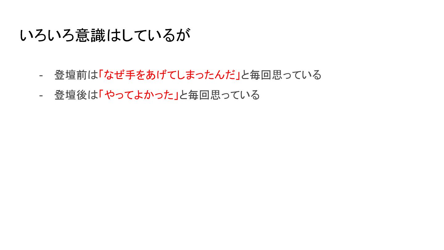 いろいろ意識はしているが - 登壇前は「なぜ手をあげてしまったんだ」と毎回思っている - 登壇後は「やってよかった」と毎回思っている