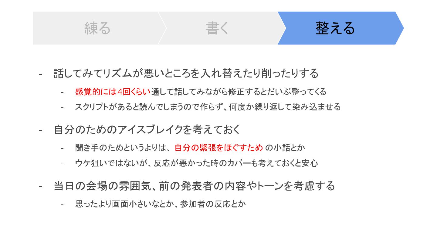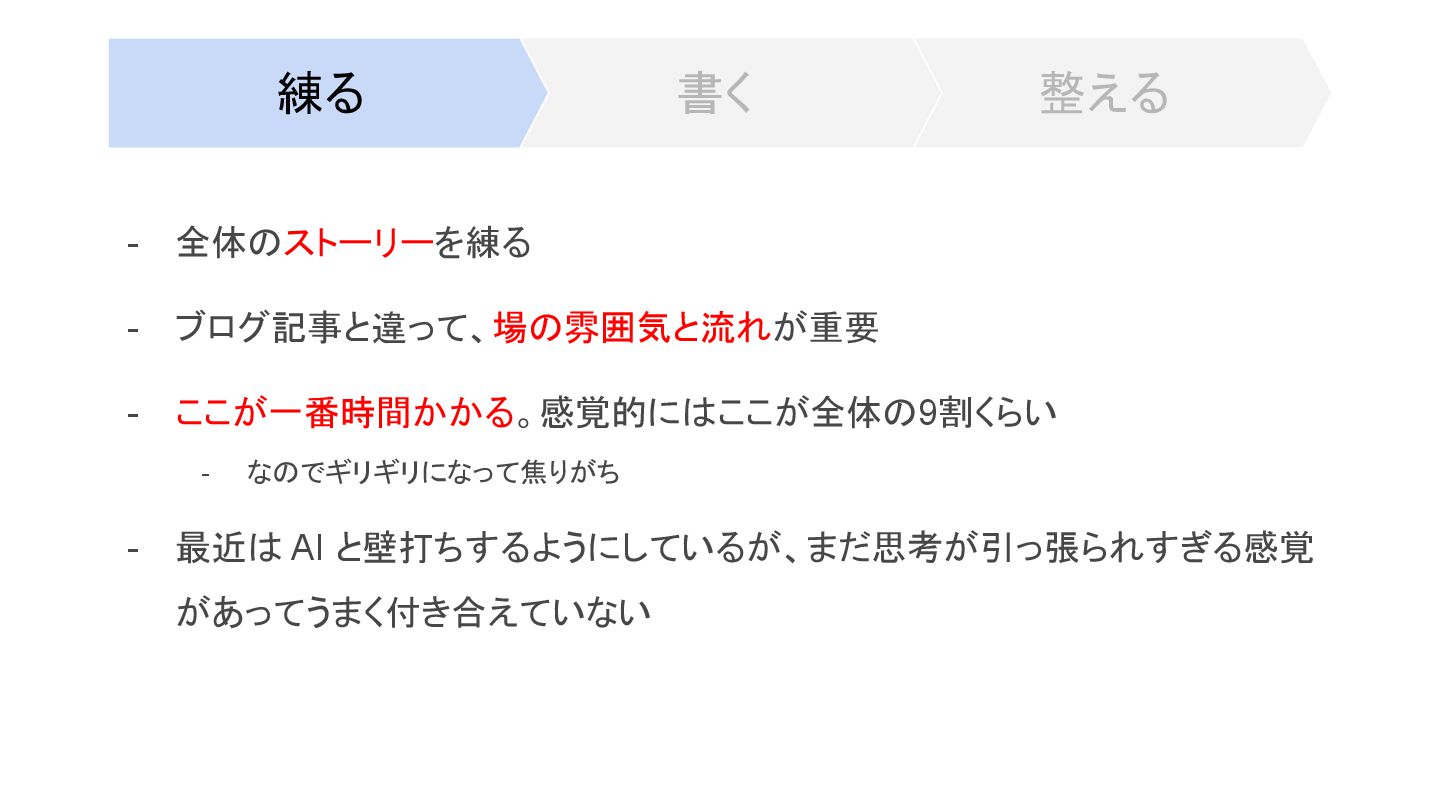 整える 書く 練る - 全体のストーリーを練る - ブログ記事と違って、場の雰囲気と流れが重要 - ここが一番時間かかる。感覚的にはここが全体の9割くらい -