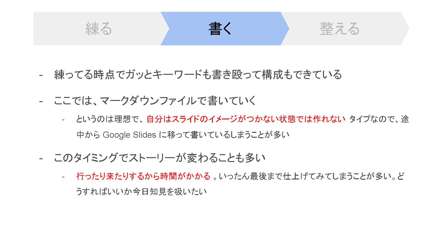 中から Google Slides に移って書いているしまうことが多い - このタイミングでストーリーが変わることも多い - 行ったり来たりするから時間がかかる 。いったん最後まで仕上げてみてしまうことが多い。ど うすればいいか今日知見を吸いたい